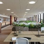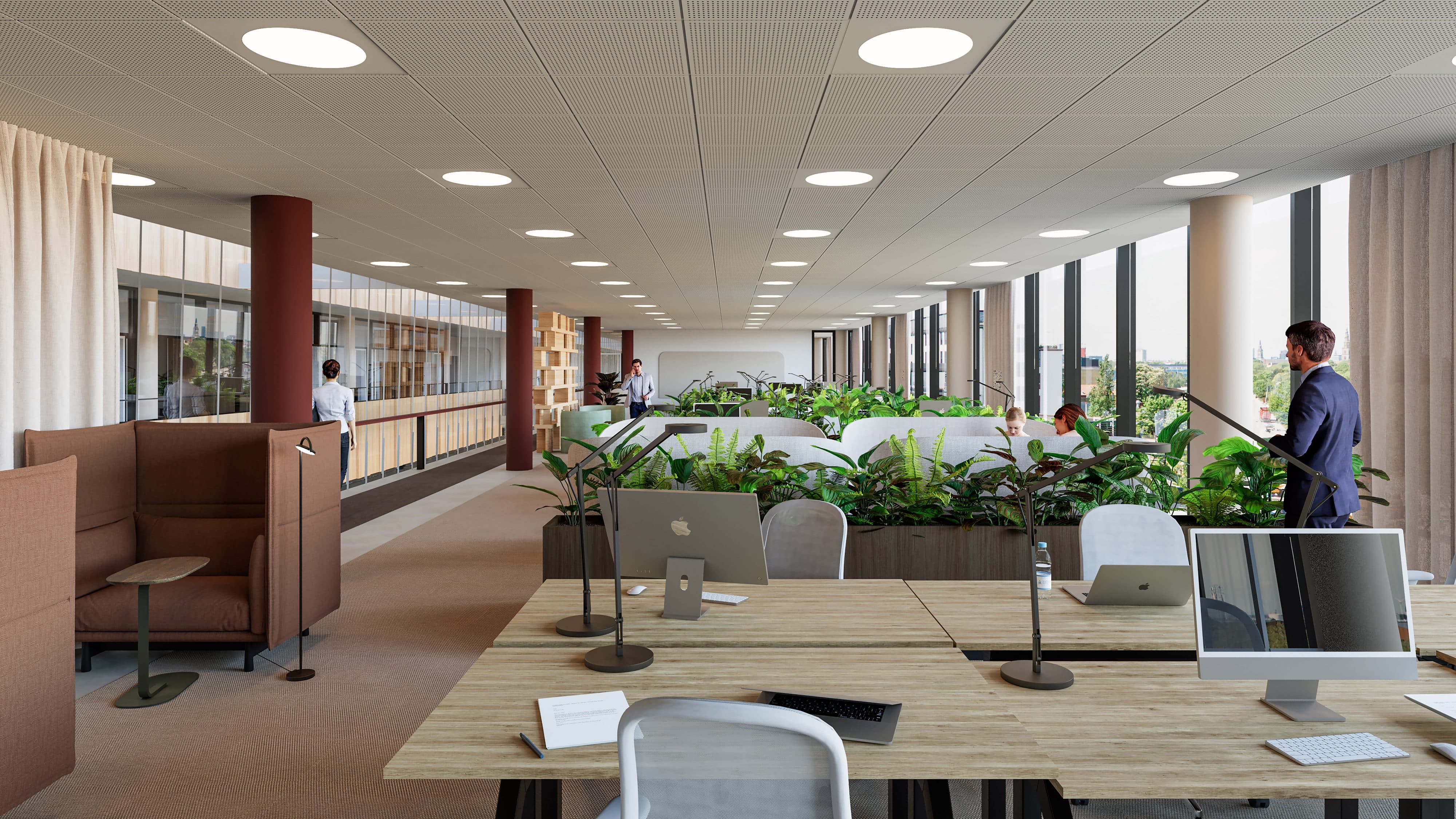 Glasfacaden mod byen giver naturligt lys og ubegrænset udsyn. Murstensfacaden mod gaden skærmer for solen. En åben planløsning sikrer fleksible arbejdsområder. Her er bistro, mødelokaler, fællesfaciliteter, parkering og kort til byen. Og så kan I flytte ind med det samme.