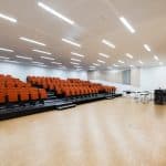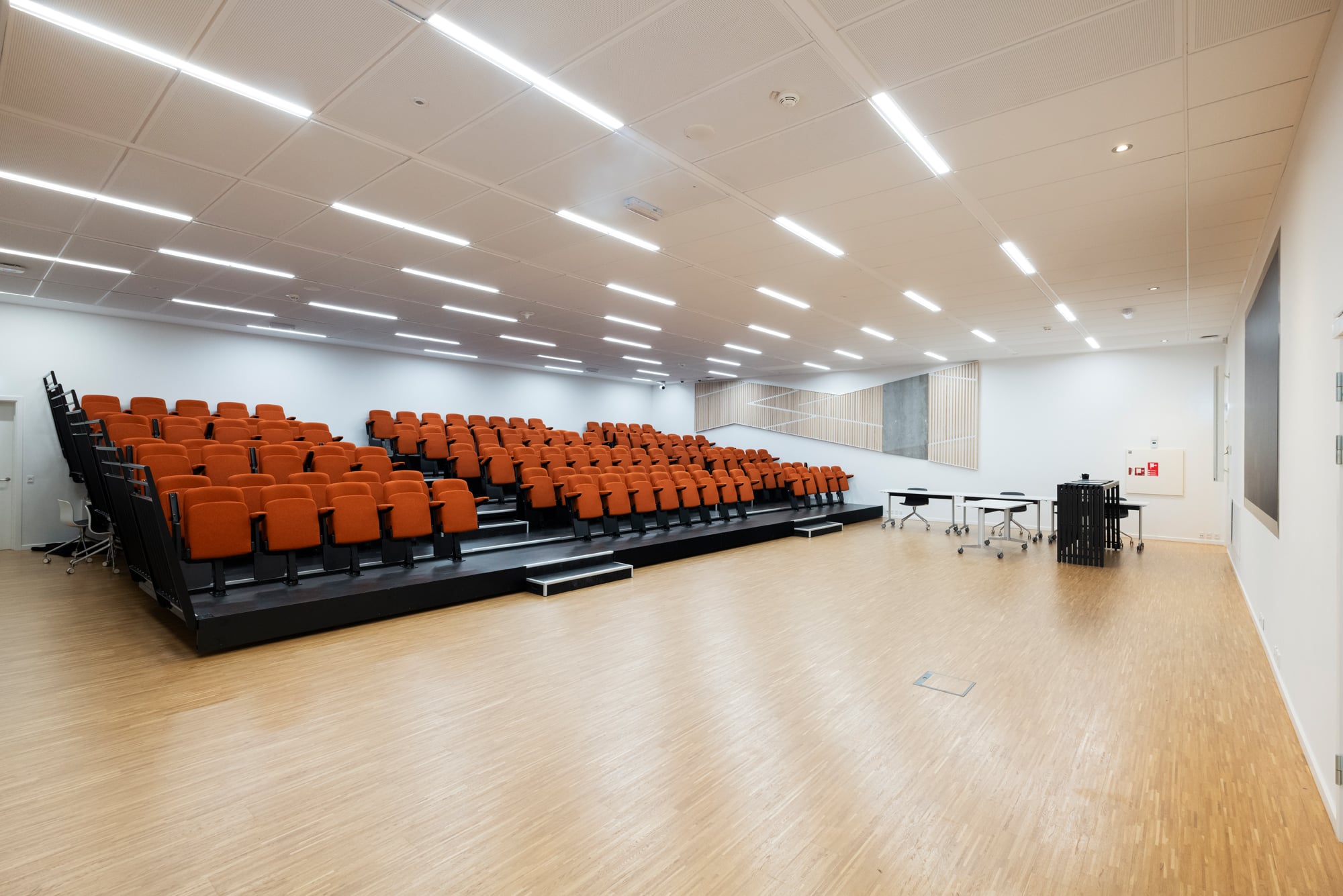 I parterre er der et mødecenter med tre større lokaler og et auditorium med plads til 150 personer, som kan lejes efter behov og giver optimale muligheder for både interne og eksterne arrangementer.