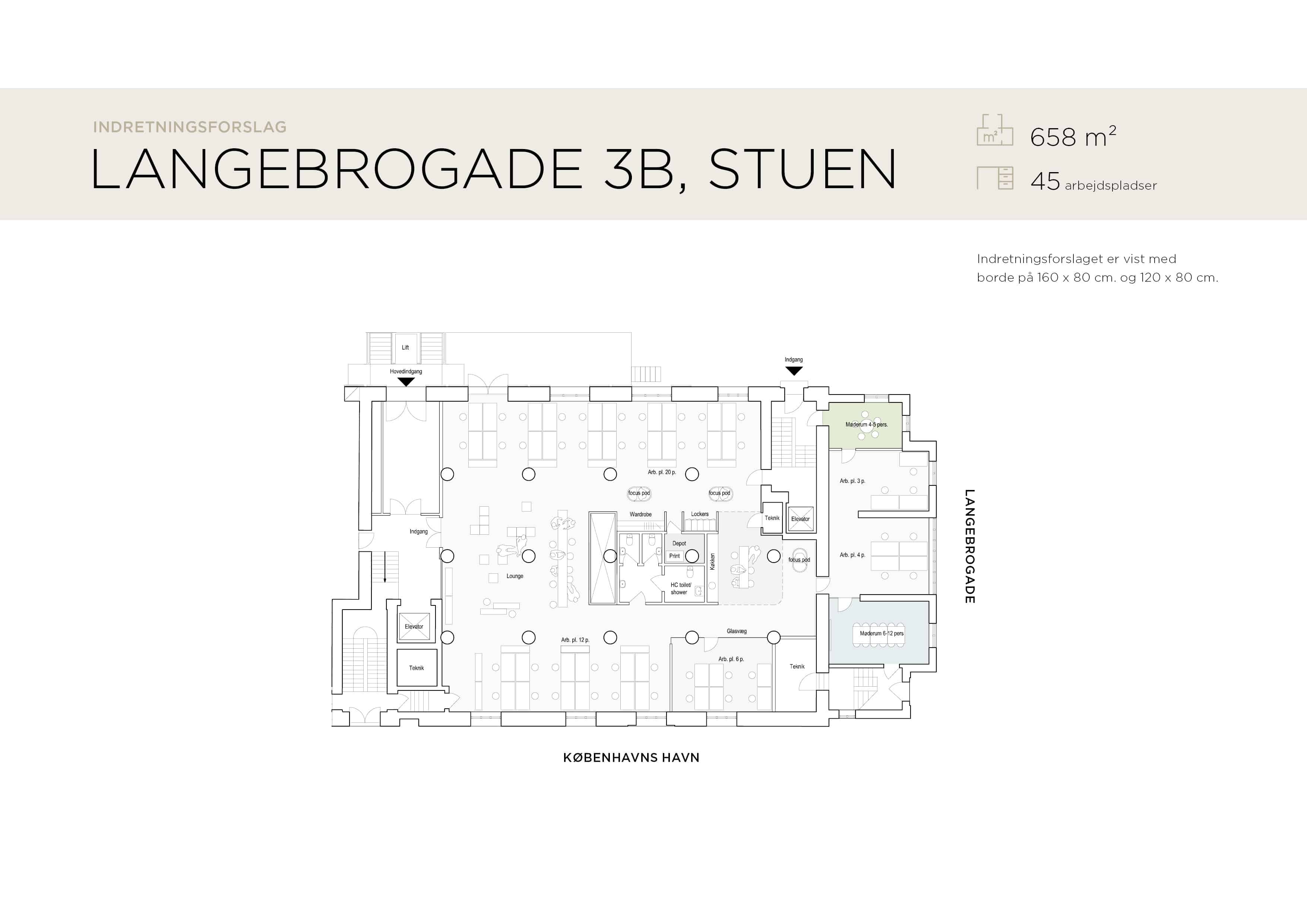 Lejemålet på Langebrogade 3B, stuen er på 658 m², har eget indgangsparti, akustiklofter, epoxygulve, synlige søjler og sortsprossede vinduer. Lejemålet har et separat mødeområde i Sukkerfabrikkens oprindelige portnerbolig, som er kendetegnet ved det smukke, buede vindue ud mod Lille Langebro. Fra lejemålet er der en fantastisk udsigt over Københavns Havn og ind mod byen.