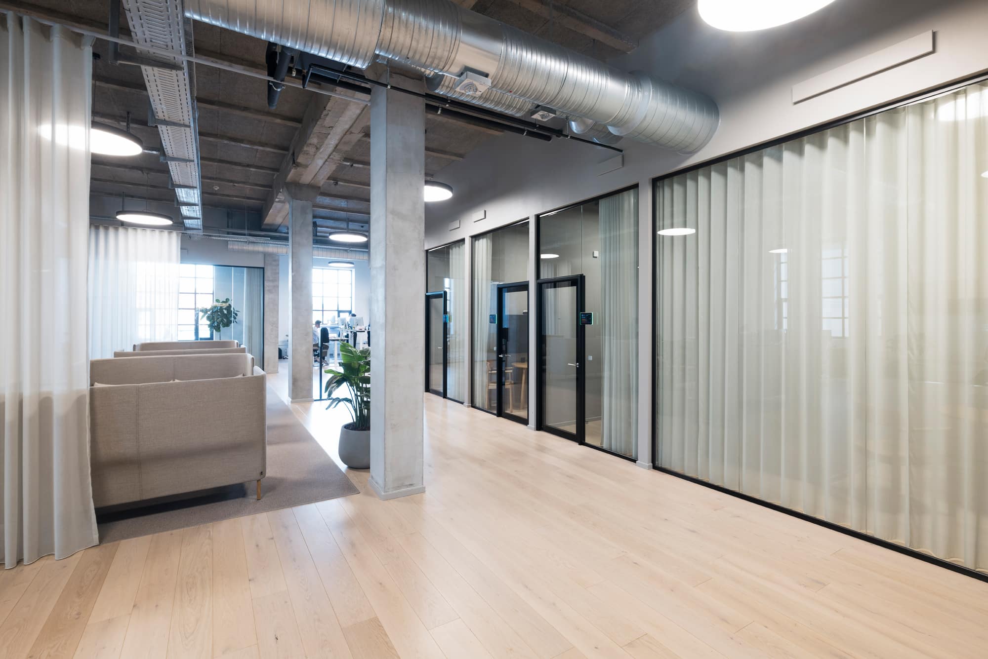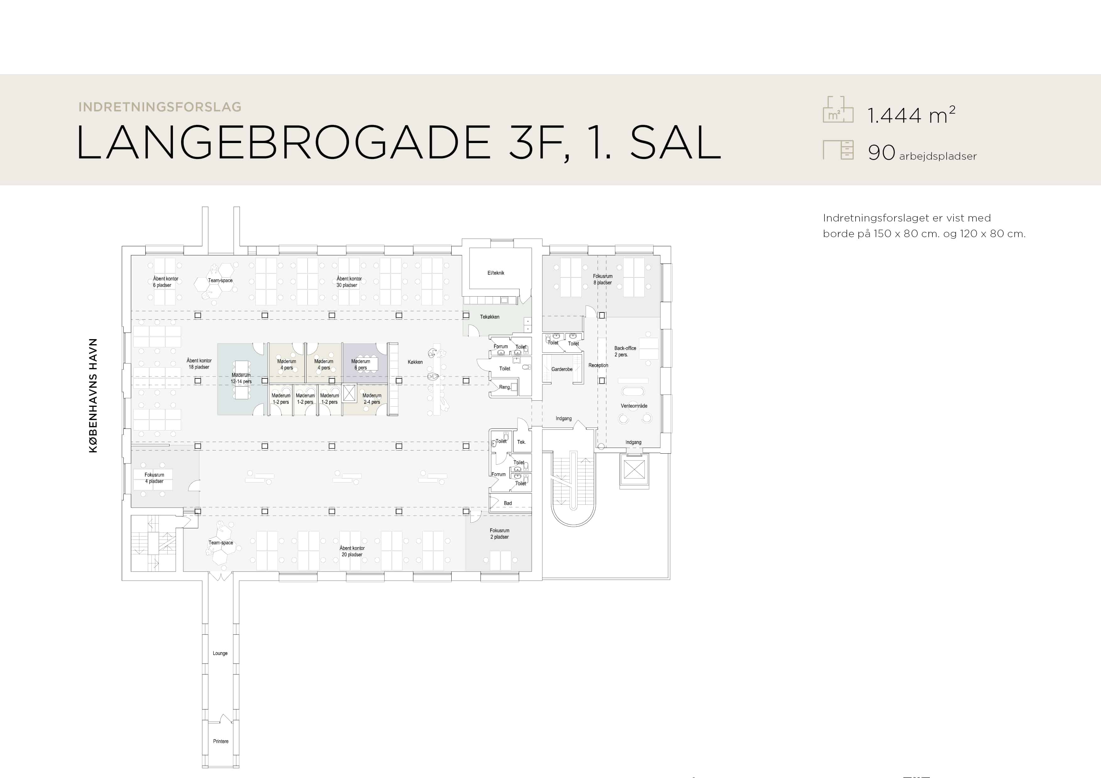 Lejemålet på Langebrogade 3F, 1. sal er 1.444 m² og fremstår åbent og rummeligt med meget højt til loftet. Trægulve, synlige installationer og sortsprossede vinduer skaber et industrielt look, der passer ind i det gamle pakhus. Lejemålet har både køl og ventilation og kan indrettes med helt op til 90 arbejdspladser. Her er der tale om et af Københavns absolut fedeste lejemål.