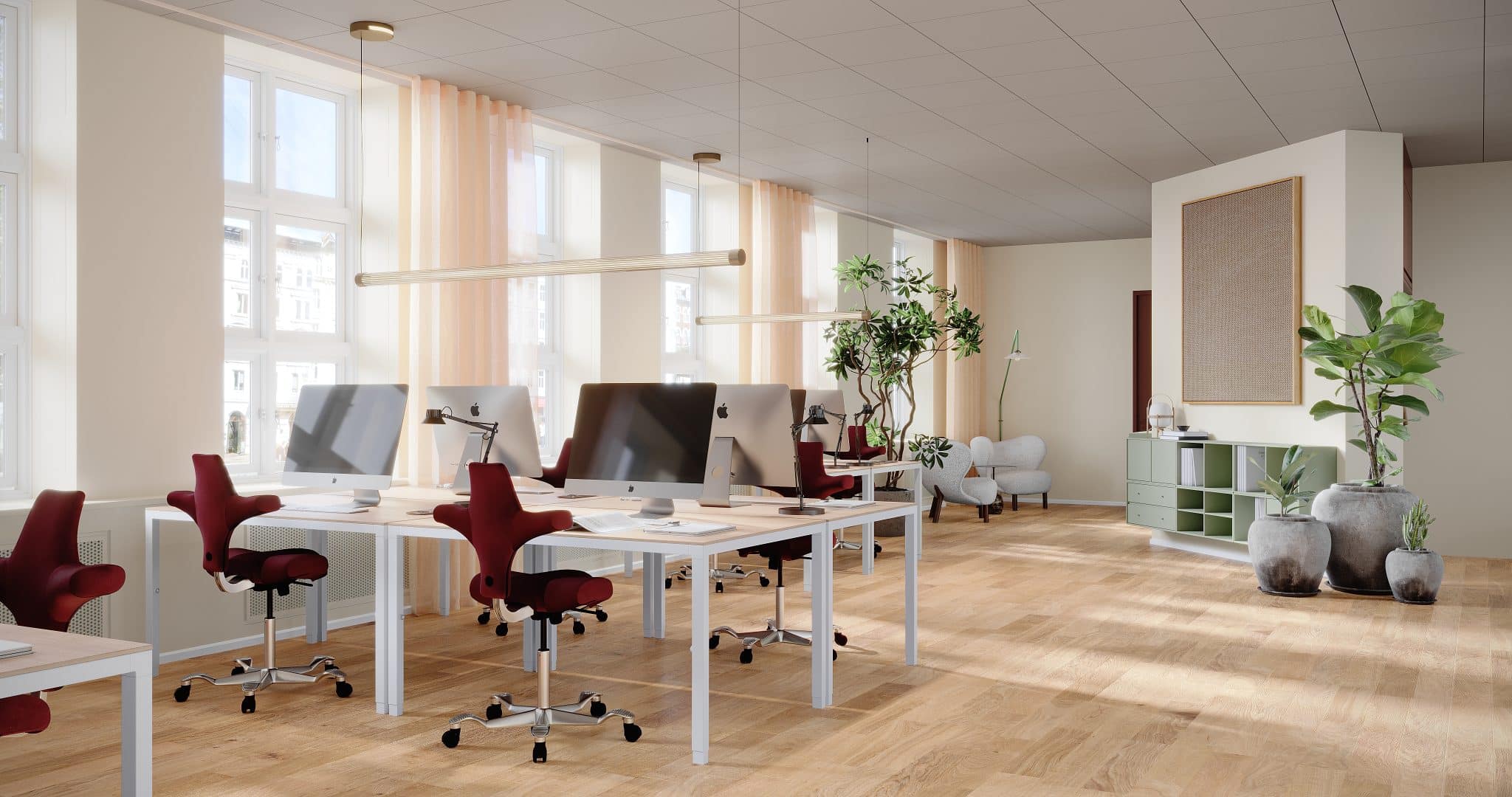 Begge etager har en imponerende loftshøjde og er indrettet med flere, aflukkede kontorer i glas. Her tilbydes et særdeles behageligt arbejdsmiljø med akustiklofter, flotte tæpper og ventilation.