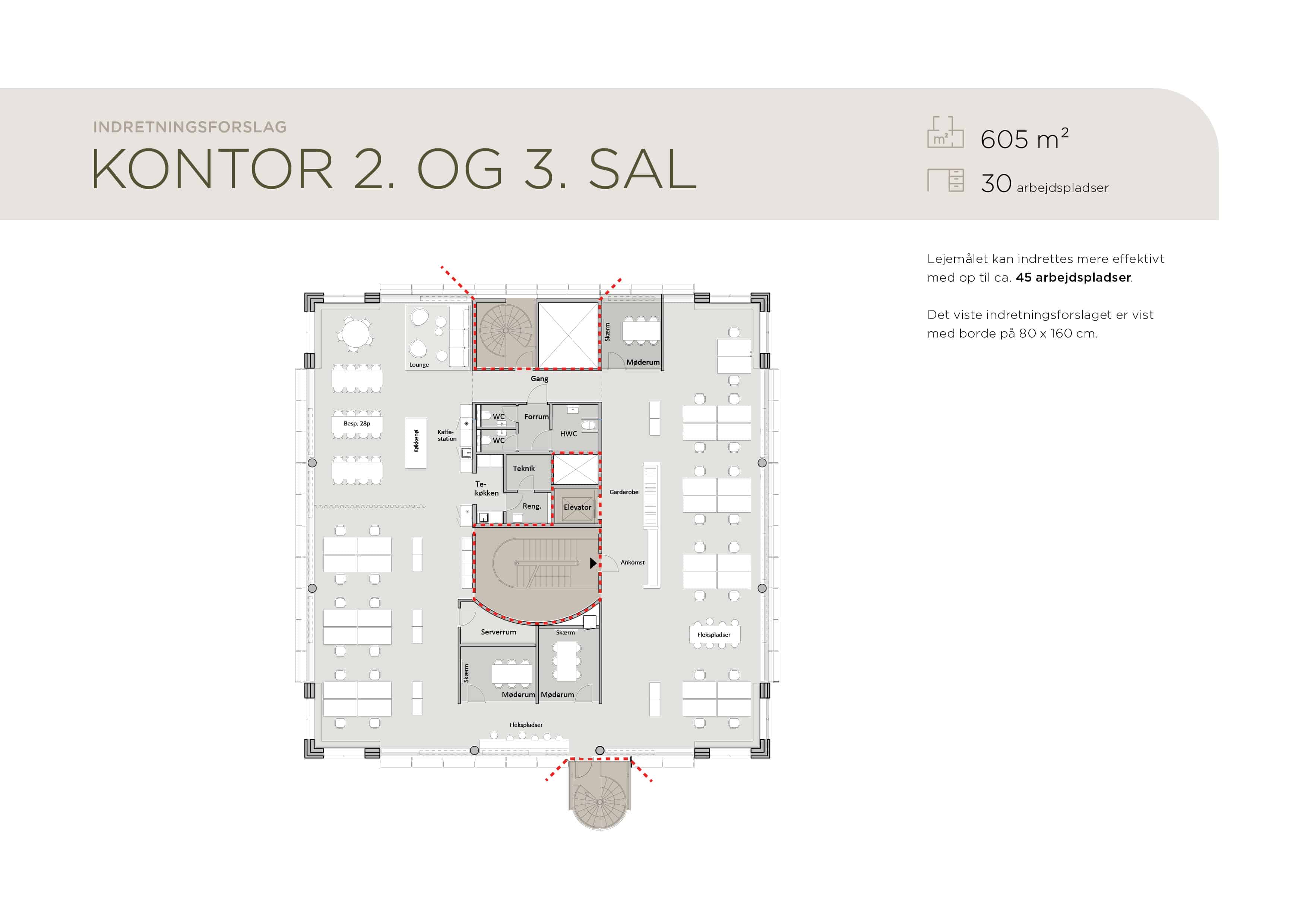 Lejemålene gennemgår en omfattende istandsættelse, hvor der virkelig er tænkt over materiale- og farvevalg. Etagerne får helt nye egetræsgulve, de nedsænkede lofter fjernes, så loftshøjden forbedres, der etableres synlig rørføring og akustiklofter samt nye køkkener, toiletter og grundbelysning. Istandsættelsen har et stort fokus på bæredygtighed og på at genbruge de materialer, der giver mening. Lejemålene kommer til at fremstå lyse og åbne og kan indrettes med ca. 30 arbejdspladser pr. etage i storrumsmiljøer. Herudover får hver etage tre mødelokaler og et stort køkkenområde med spiseplads og loungeområde.