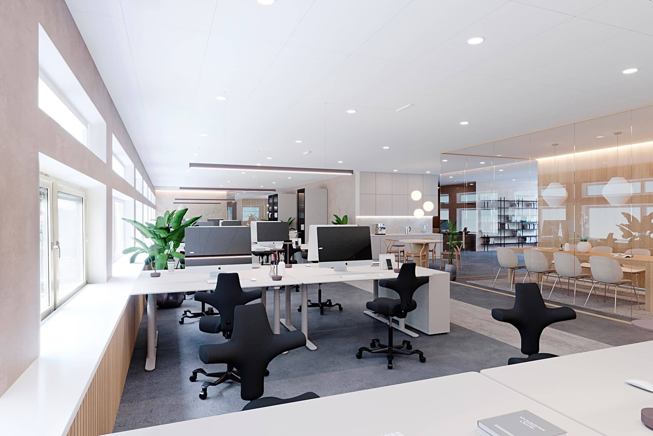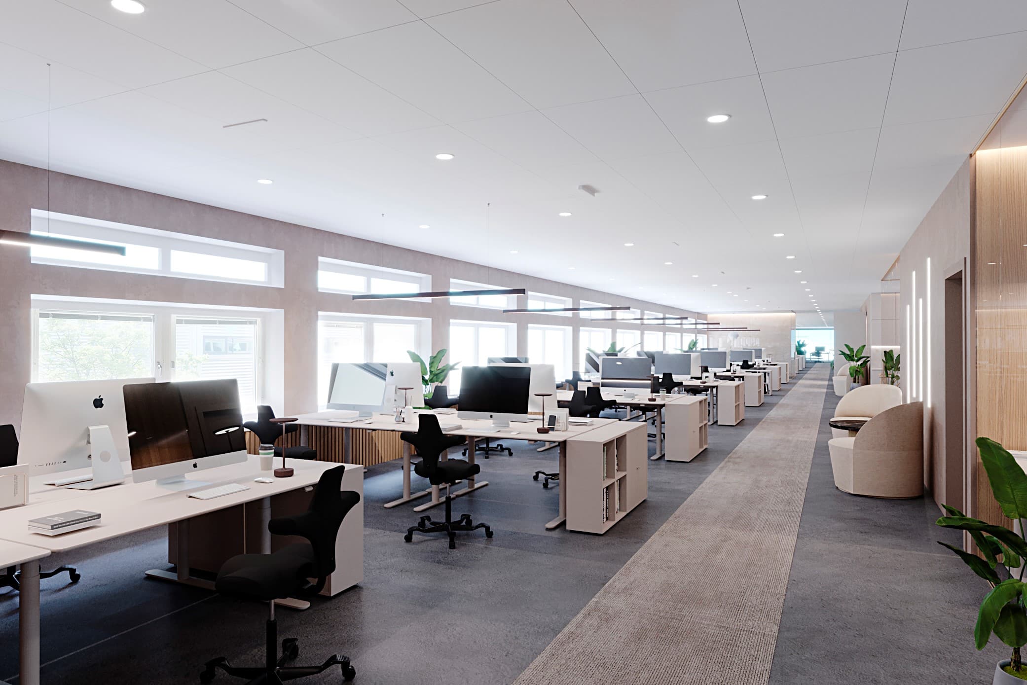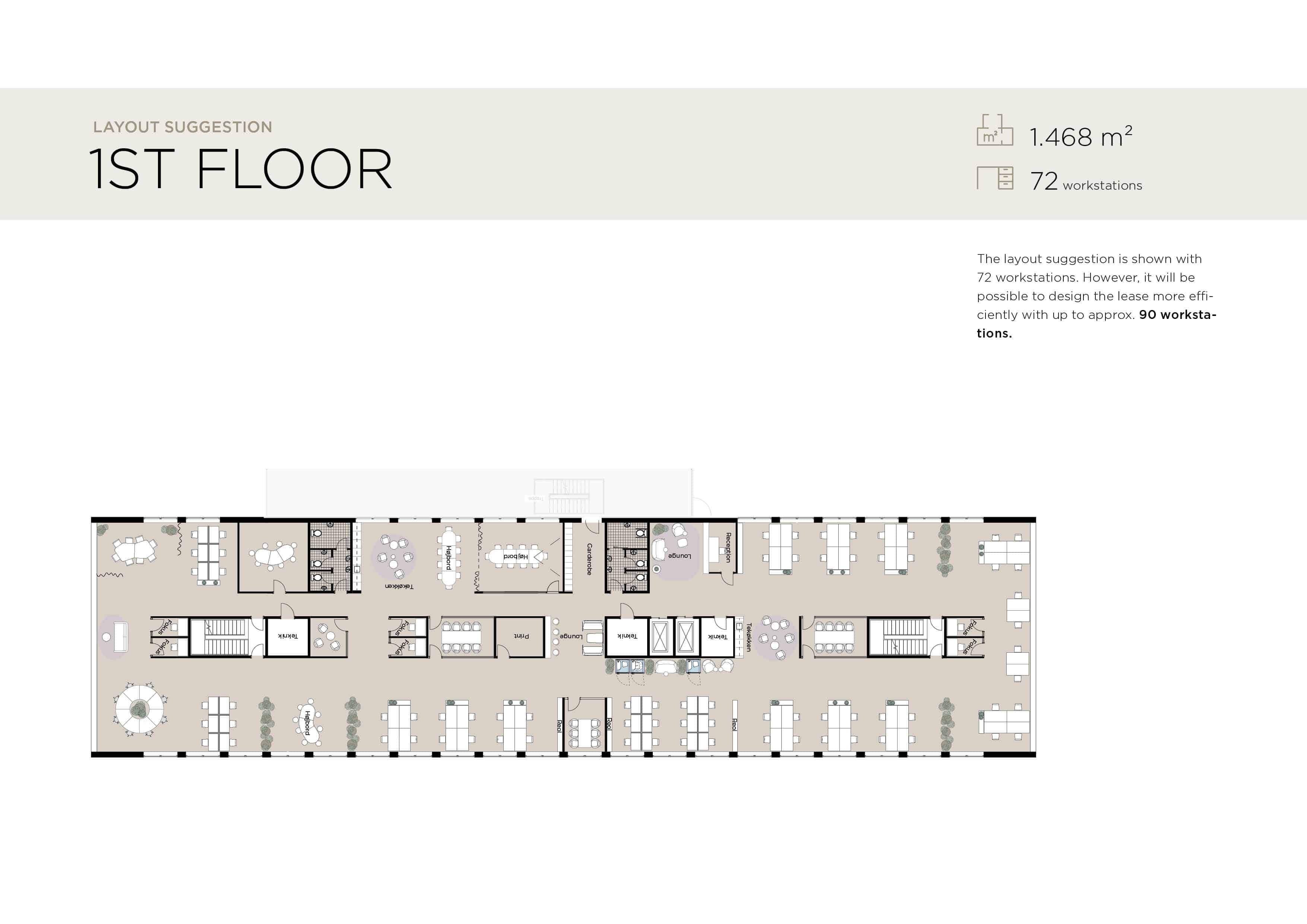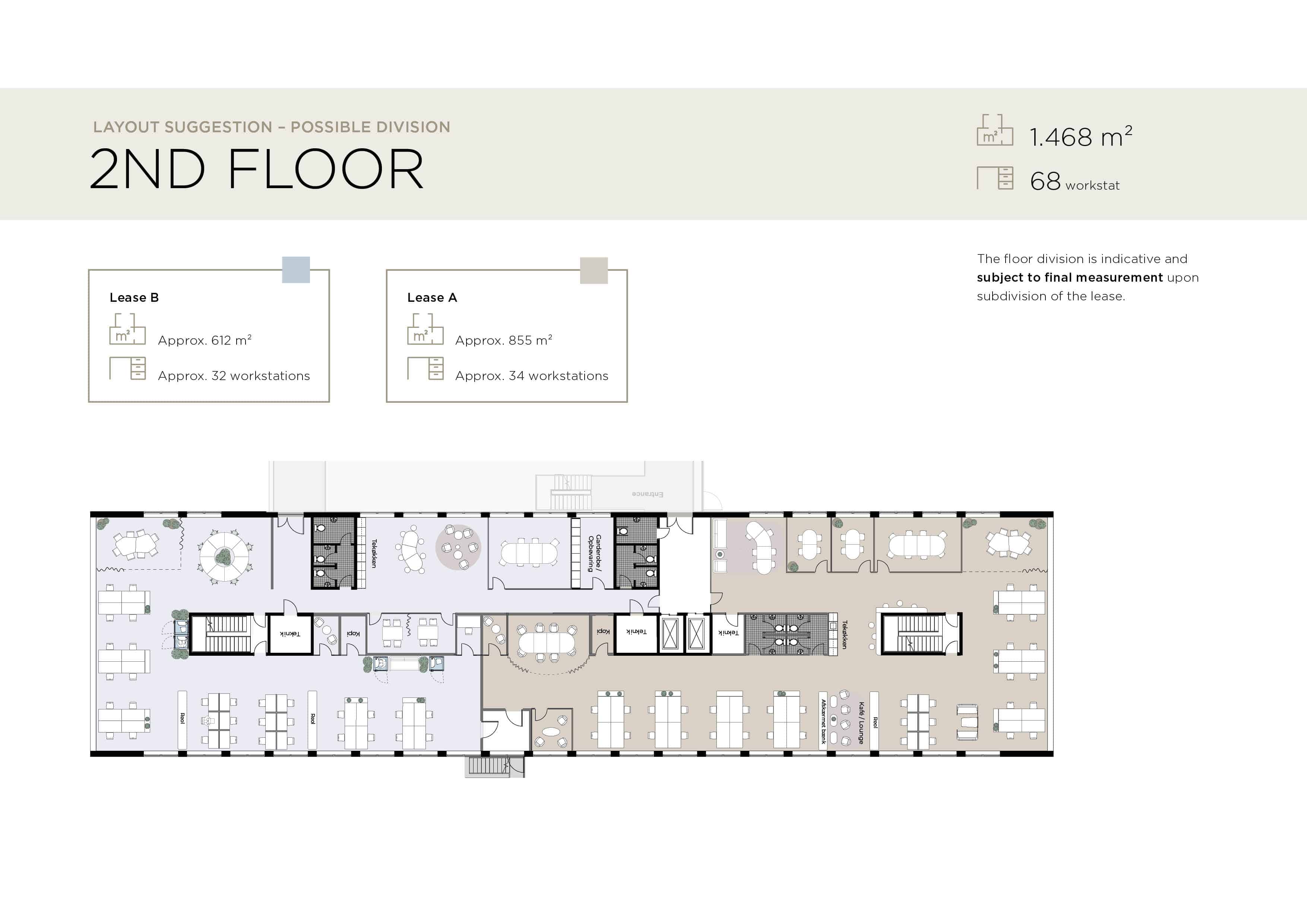 On the 1st and 2nd floors, there are two leases of 1,468 m² each, which can be divided into two smaller leases of approx. 612 m² and 855 m², respectively. Providing flexible area options, ranging from half a floor up to two full floors. The leases are efficiently designed, primarily with open-plan offices and several meeting rooms, but the layout can be customized according to the tenant’s wishes and needs.