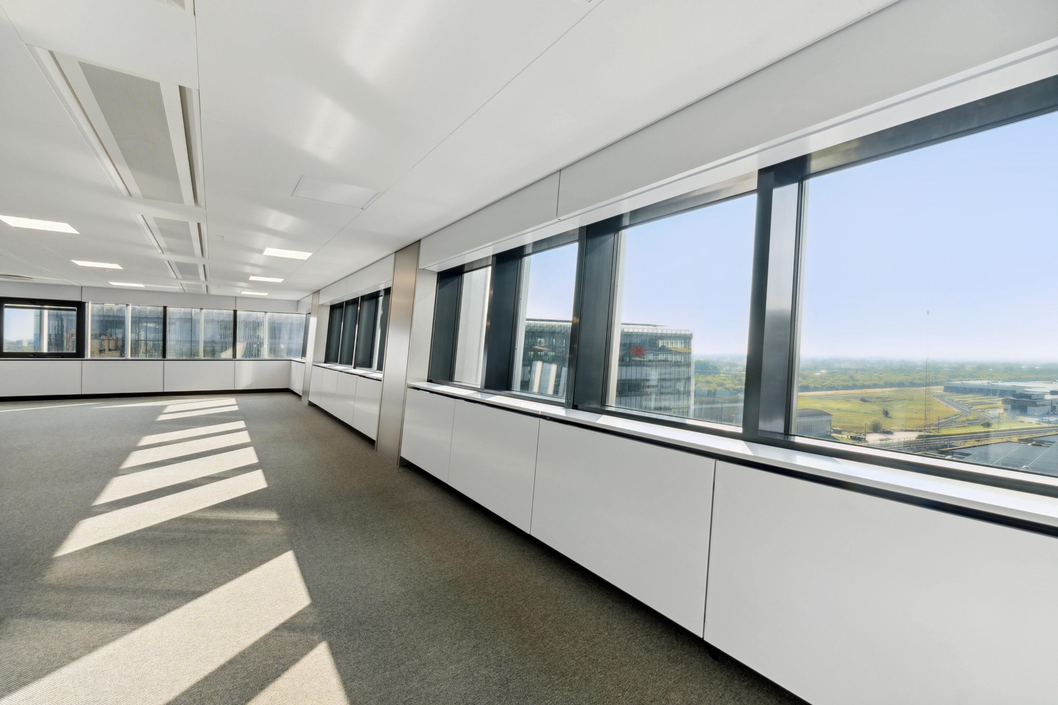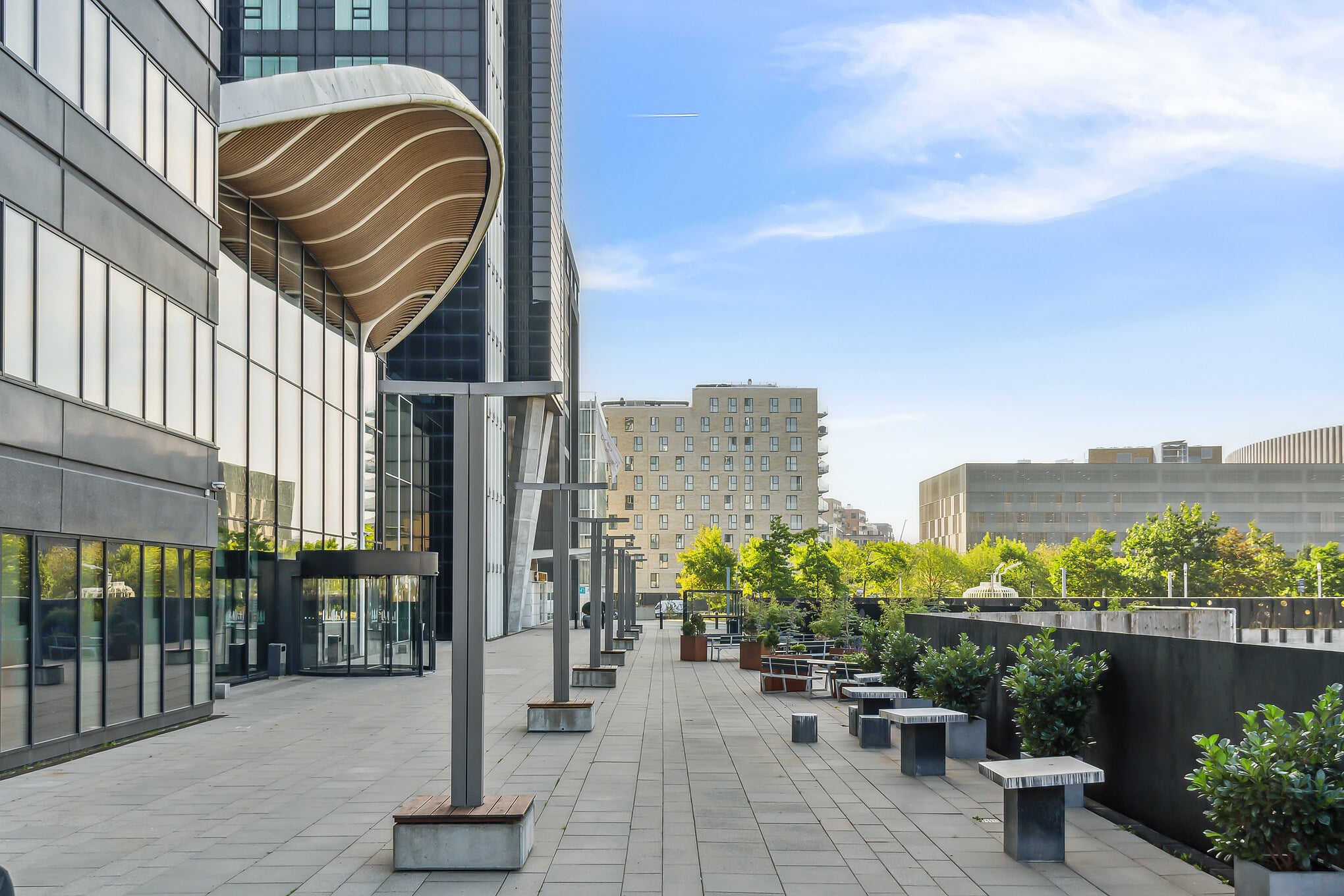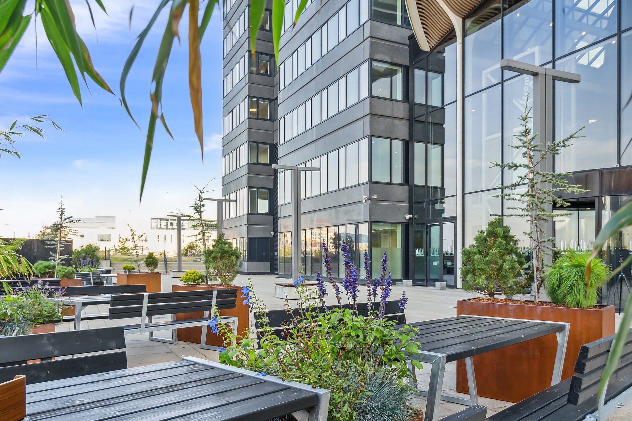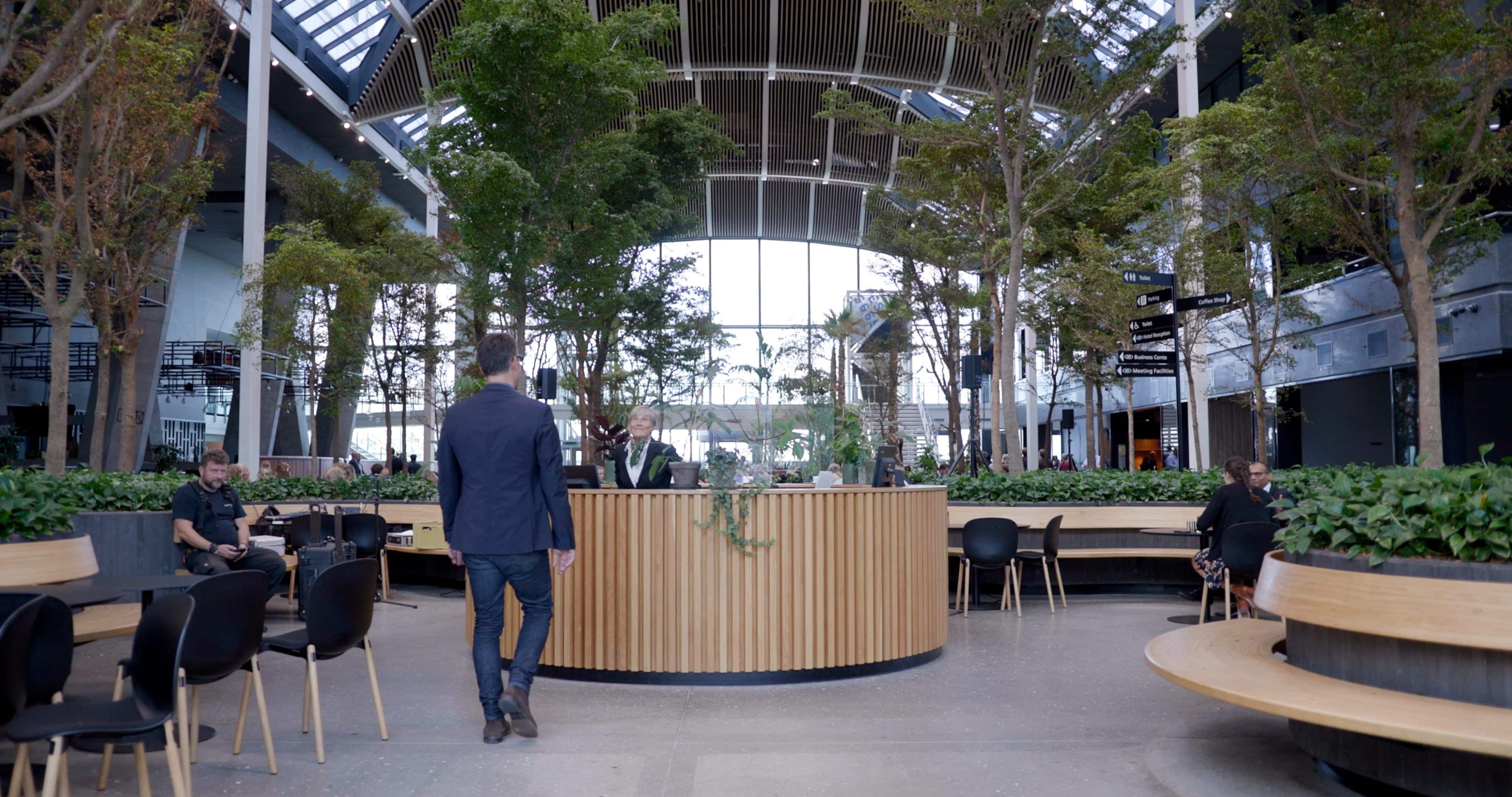 The building welcomes visitors through an inspiring atrium with a beautifully landscaped green oasis, creating a calm and inviting atmosphere that connects the two towers. Tenants also enjoy access to a wide range of attractive services and facilities, including a staff restaurant, changing and shower facilities, reception services, a meeting centre, fitness area, as well as a hotel, bar, lounge, and café.