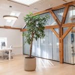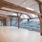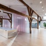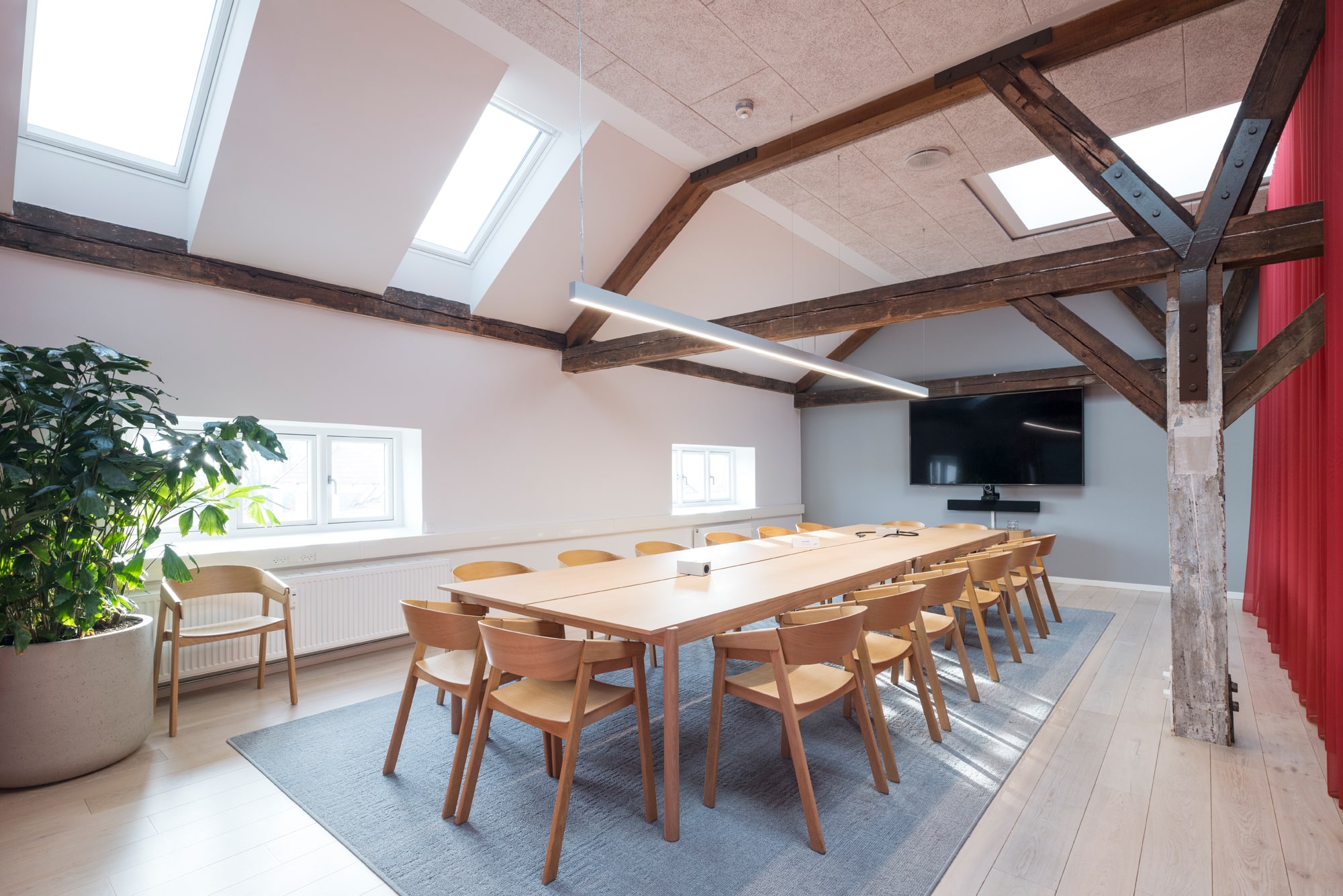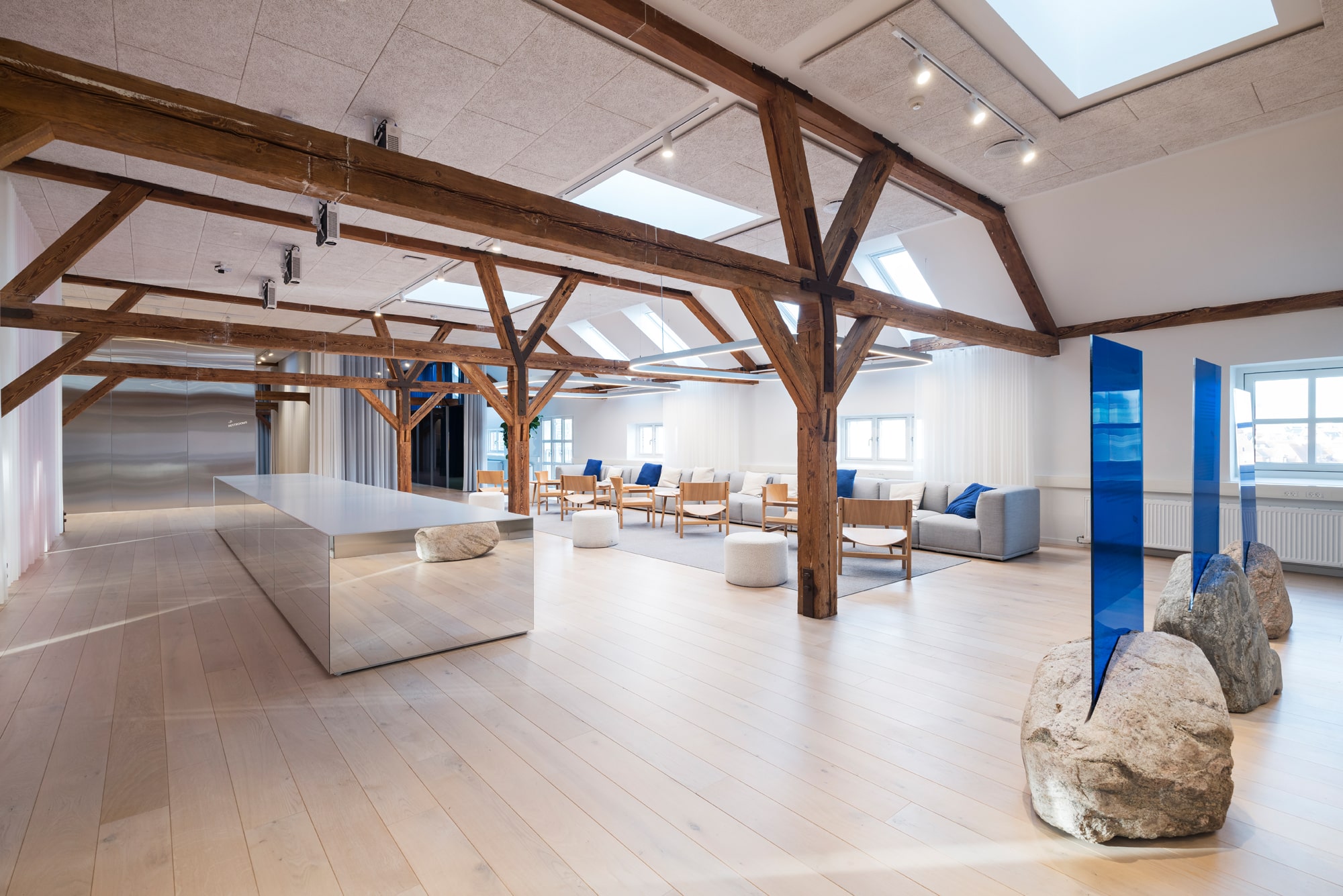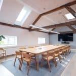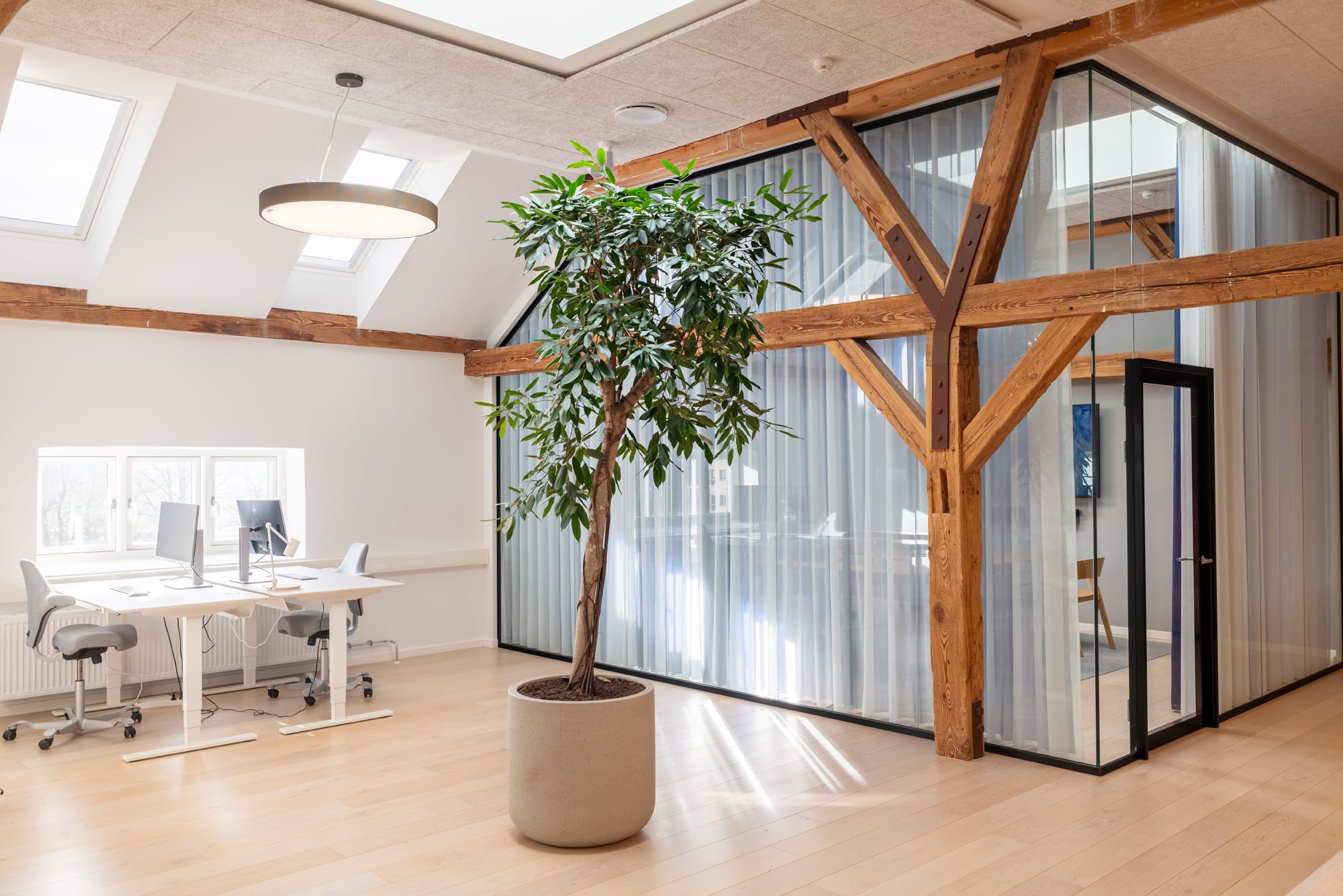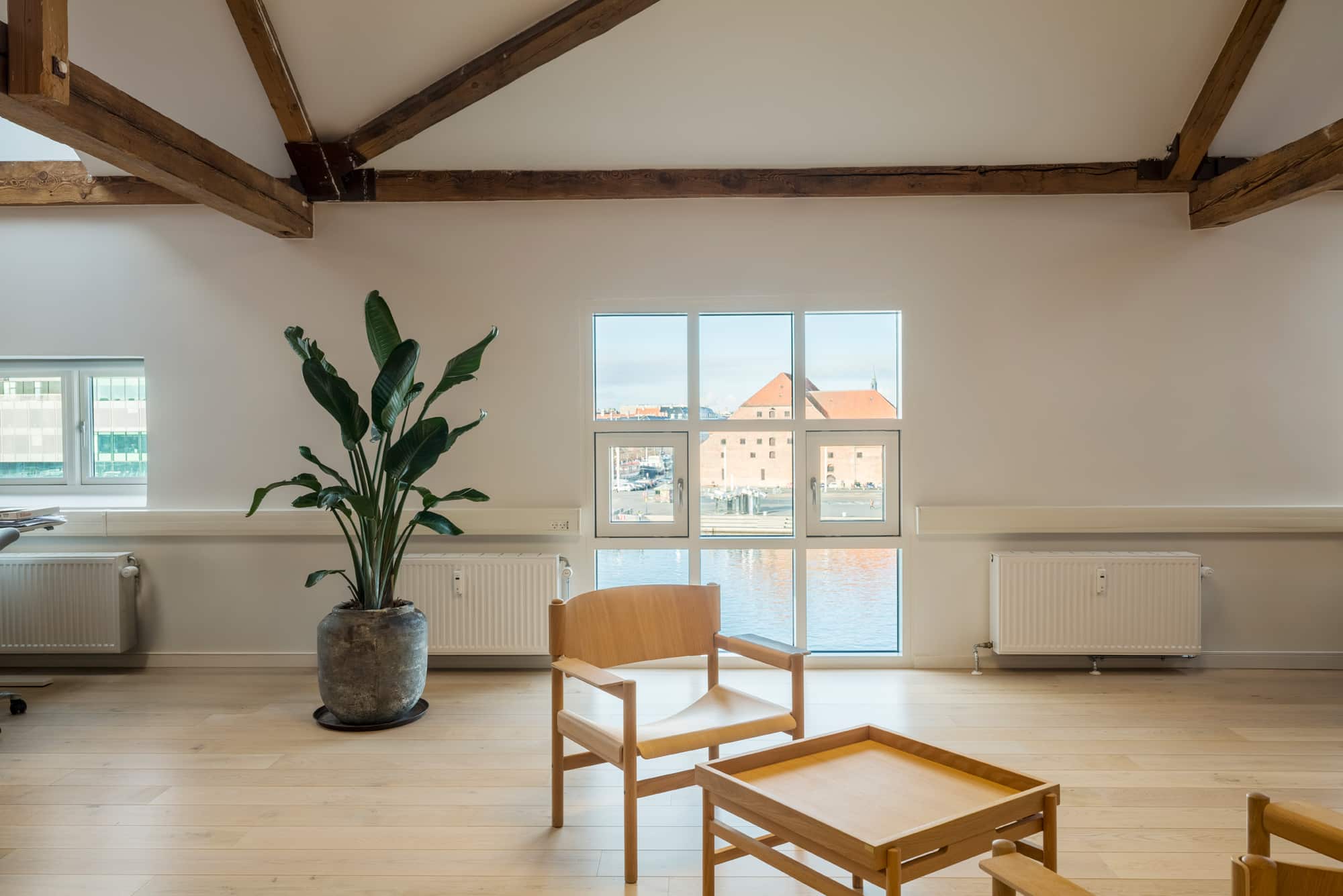 At Langebrogade 3B, the ground floor lease is 658 m², has its own entrance, acoustic ceilings, epoxy floors and black-framed windows. There is a separate meeting area in the original gatekeeper’s house with the distinctive arched window towards Lille Langebro.