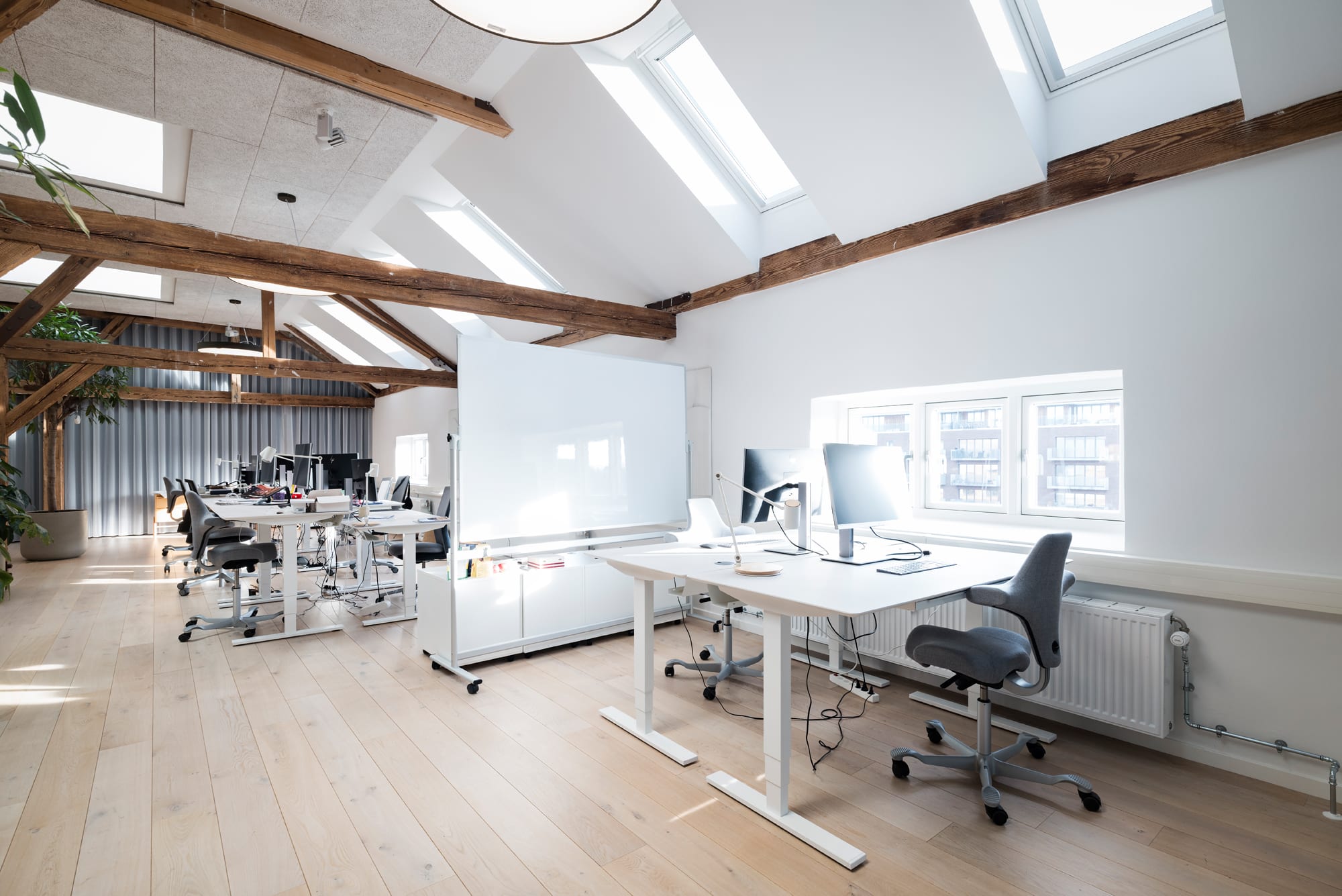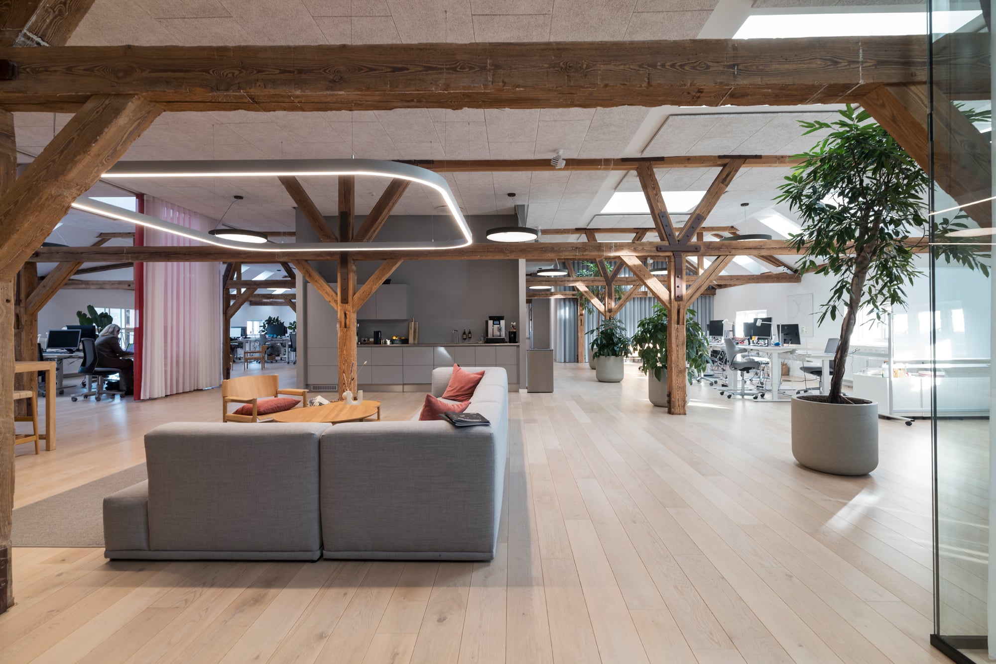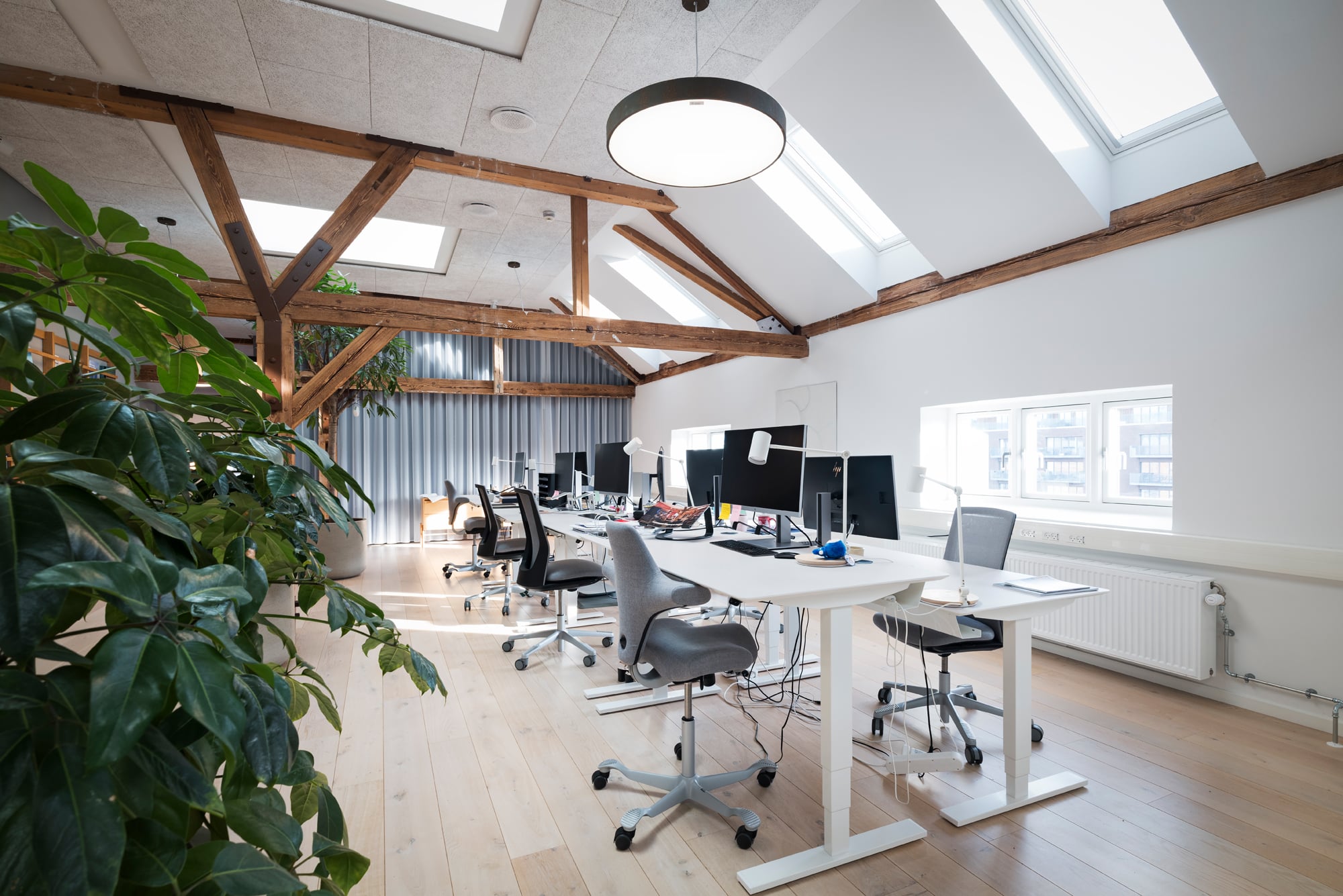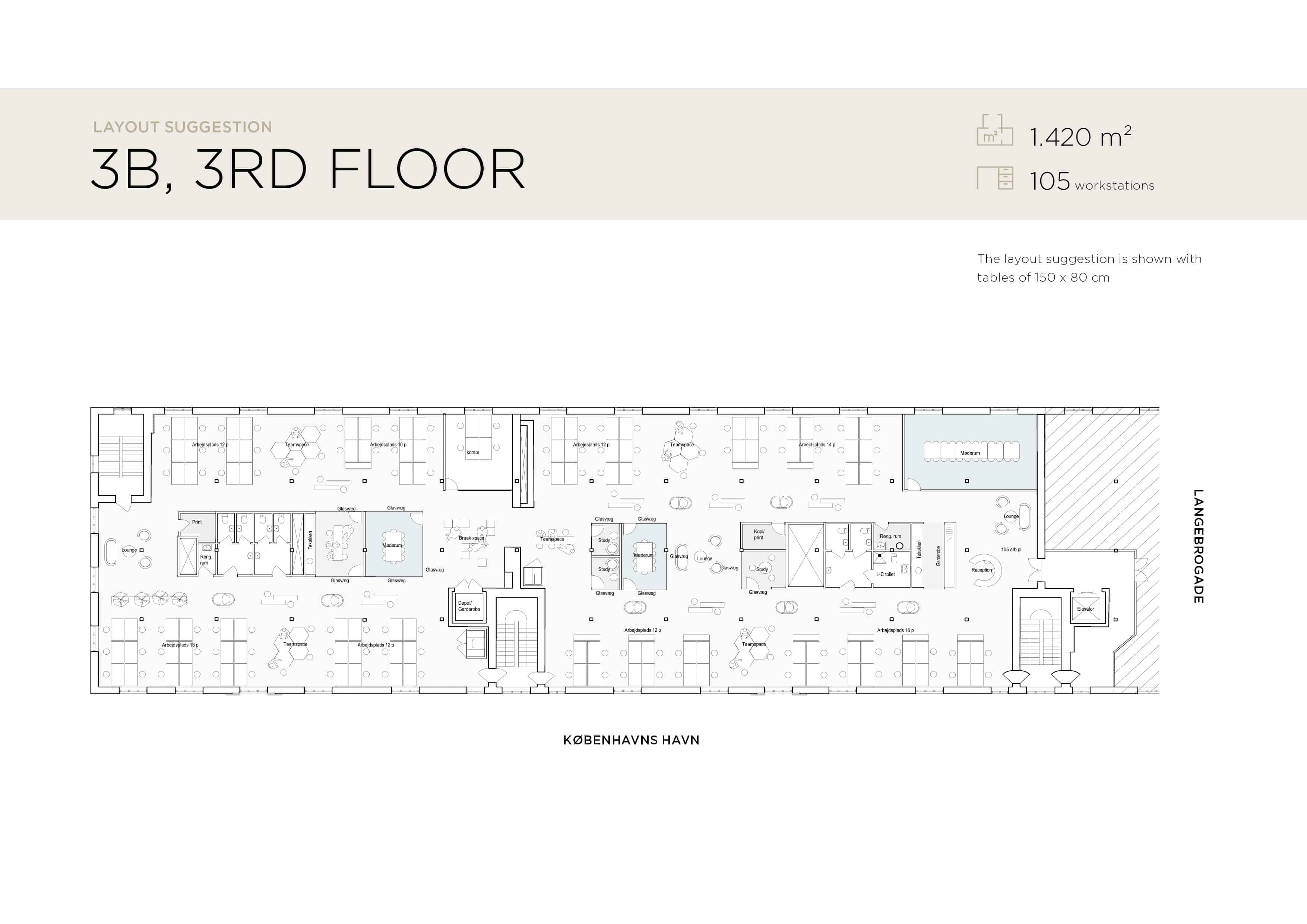 The lease on the third floor is 1,420 m² and present an exclusive warehouse style with wooden floors, exposed beams, acoustic ceilings, and raw steel details. From the premises, there is a magnificent view over Copenhagen Harbour and towards the city.