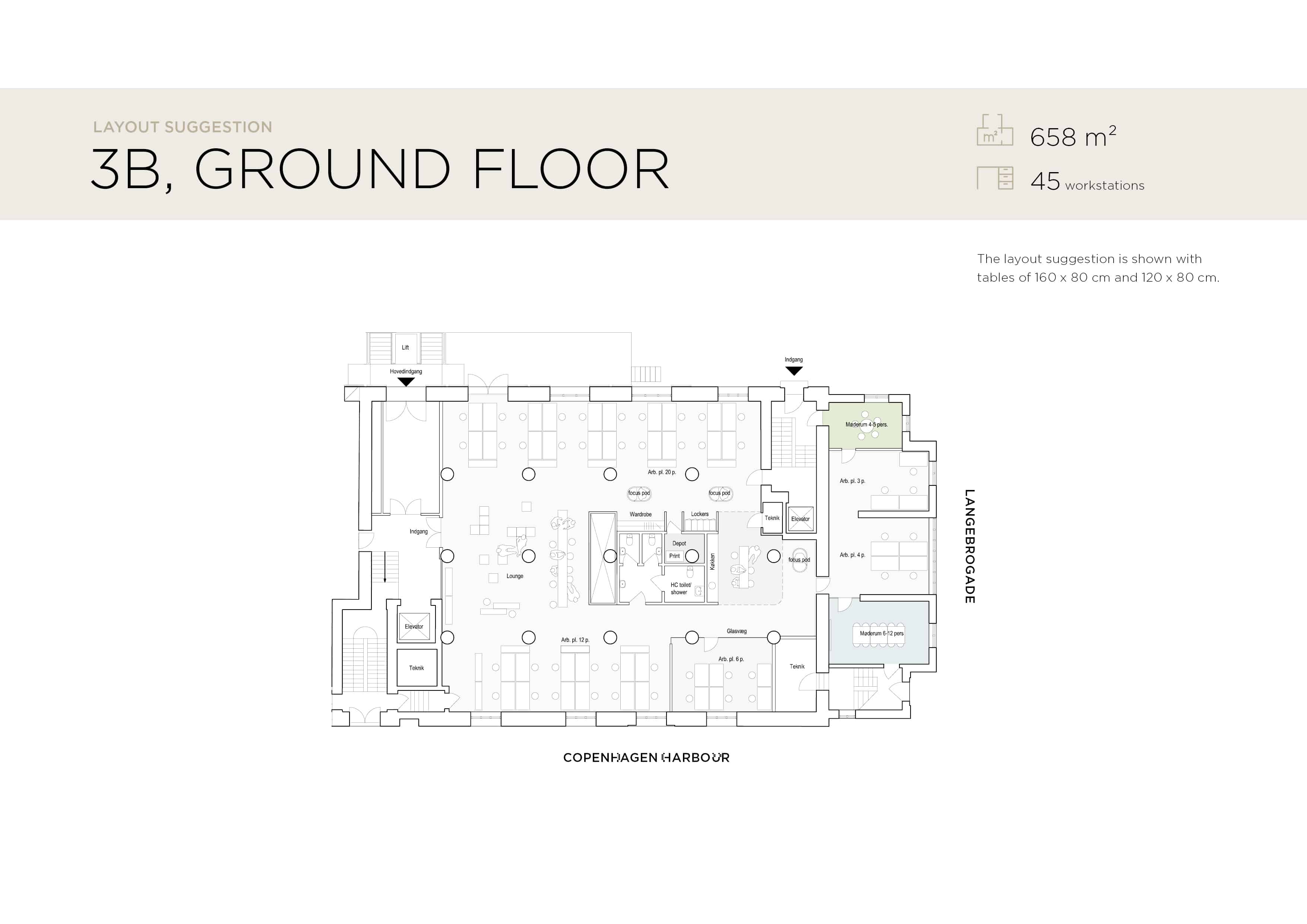 Langebrogade 3B, ground floor is 658 m², has its own entrance, acoustic ceilings, epoxy floors, exposed columns and black-framed windows. There is a separate meeting area in the original gatekeeper’s house with its distinctive arched window towards Lille Langebro. The lease has fantastic views of Copenhagen and the city skyline.