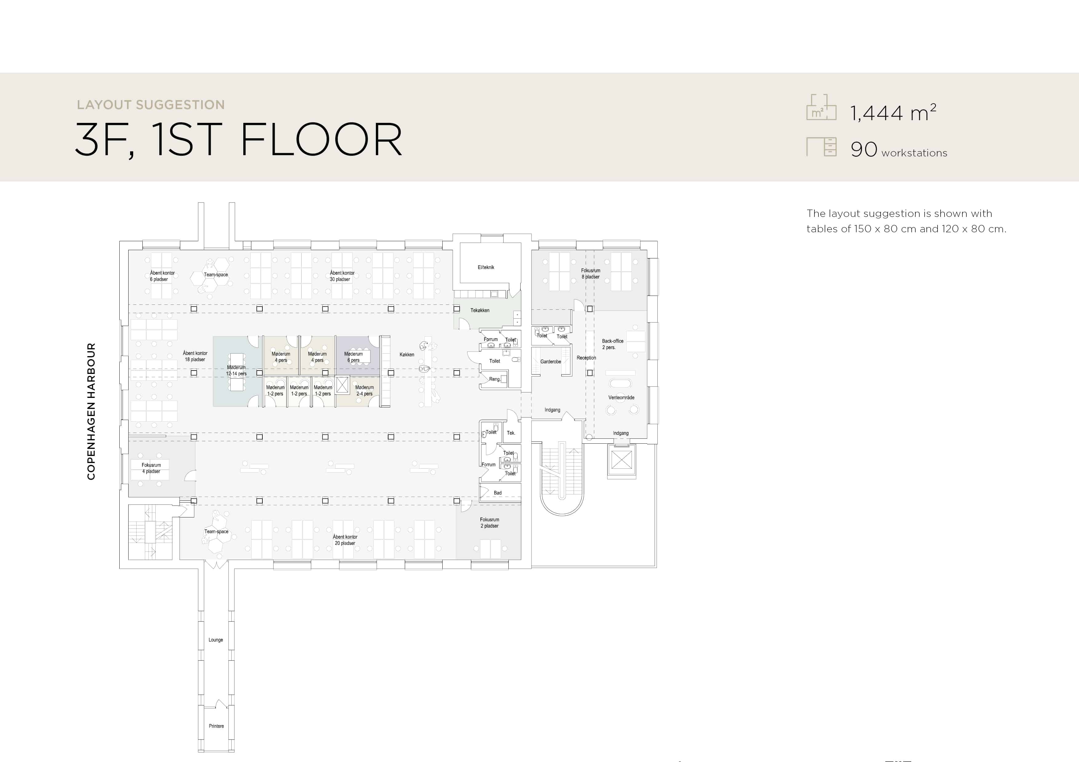 The lease on Langebrogade 3F, 1st floor is 1,444 m², open and spacious with great ceiling height. Wooden floors, visible installations and black-framed windows gives an industrial look, that matches the old warehouse. The lease is equipped with cooling and ventilation and can be arranged with up to 90 workstations. This is truly one of Copenhagen’s coolest leases.