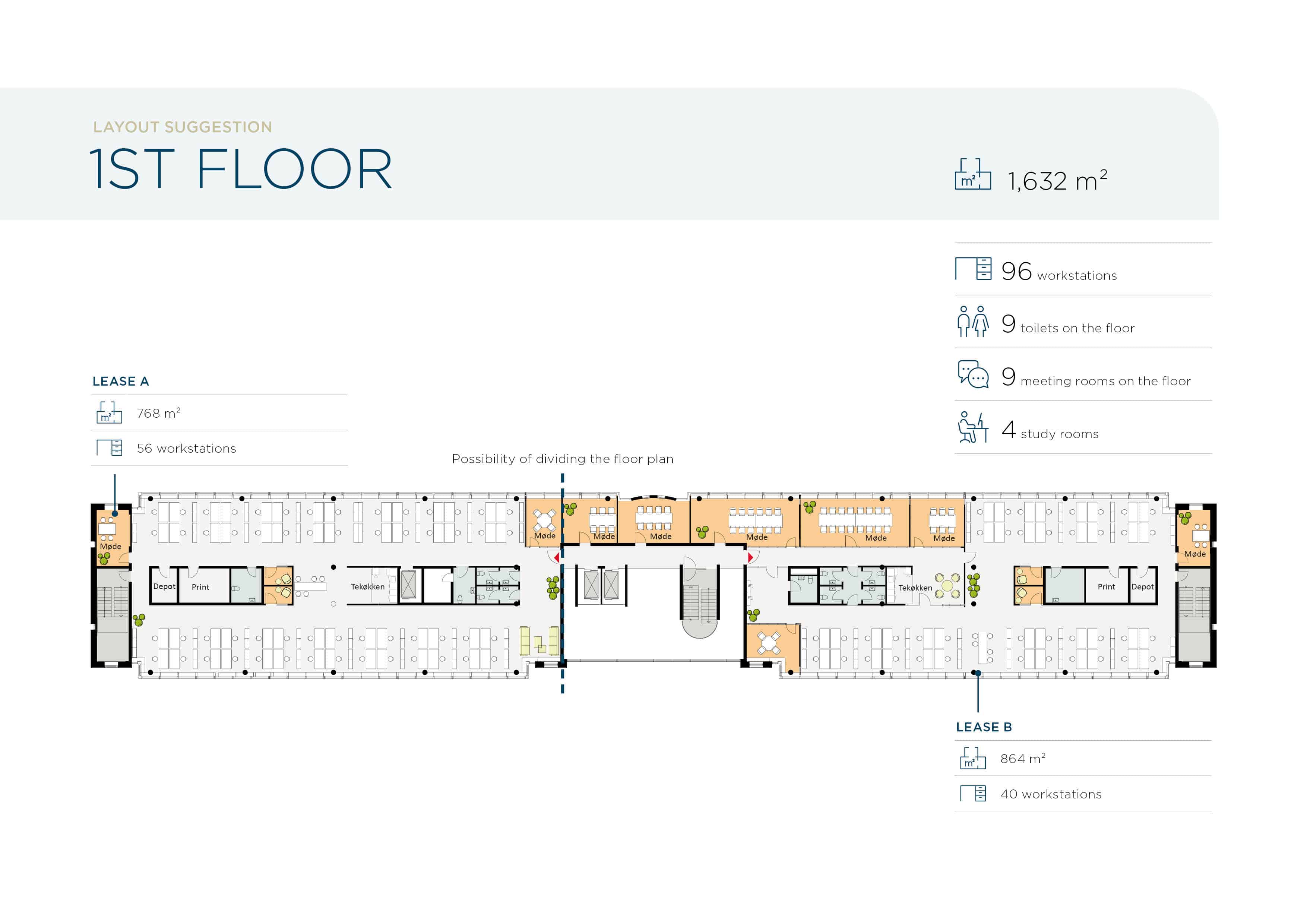 Located directly on the harbour quay, the multi-user property Midtermolen 1–3 now offers a 1,632 m² office lease. The available office is situated on the 1st floor of Midtermolen 3 and boasts a truly fantastic view of the water. If a smaller area is required, the lease can also be divided into two separate lease of 768 m² and 864 m², respectively.