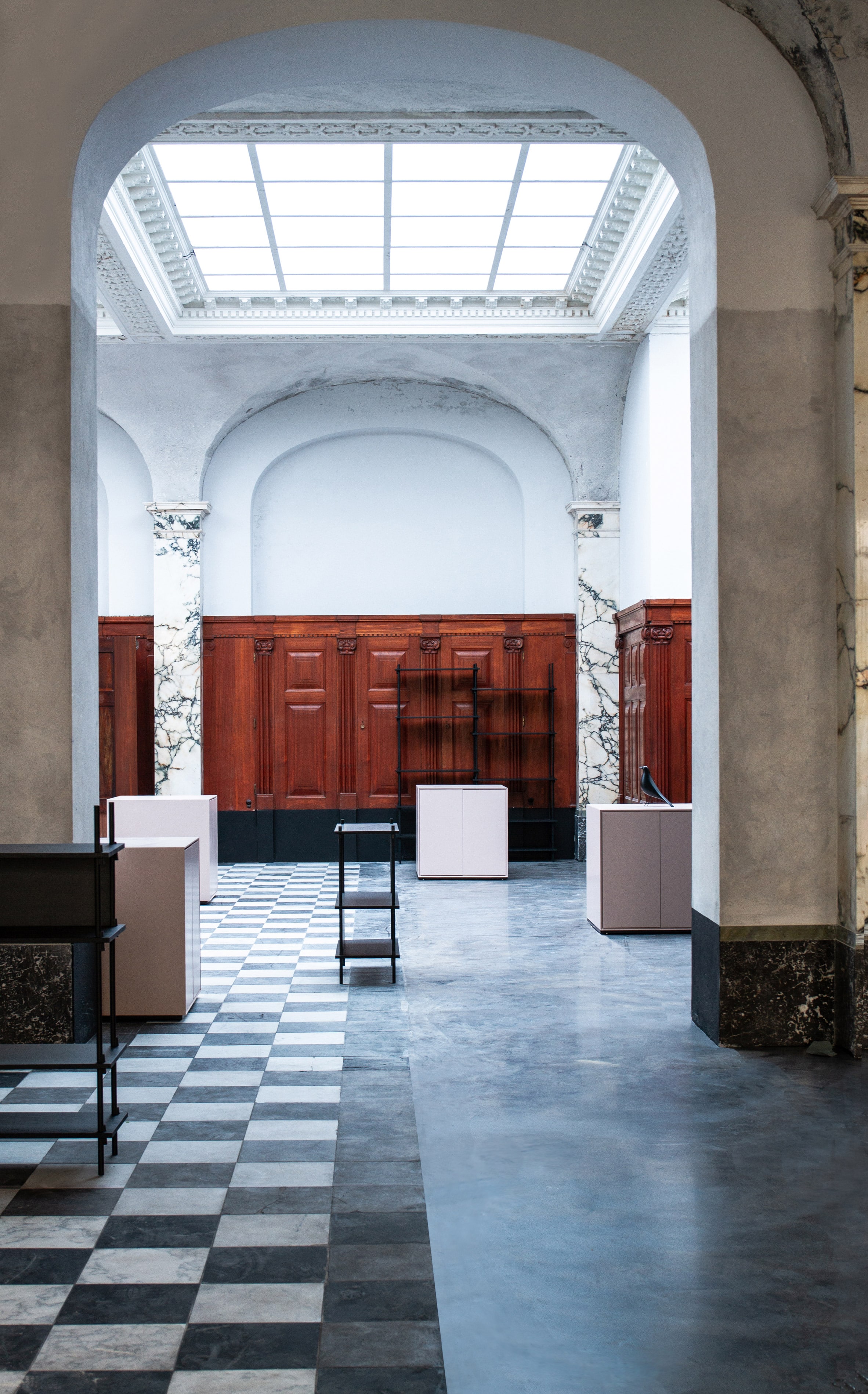 With vaulted doors heavy as mountains and ceilings rising more than four meters above the black-and-white marble floors, the rooms are illuminated by a magnificent skylight, offering a spatial experience rarely found in Copenhagen.