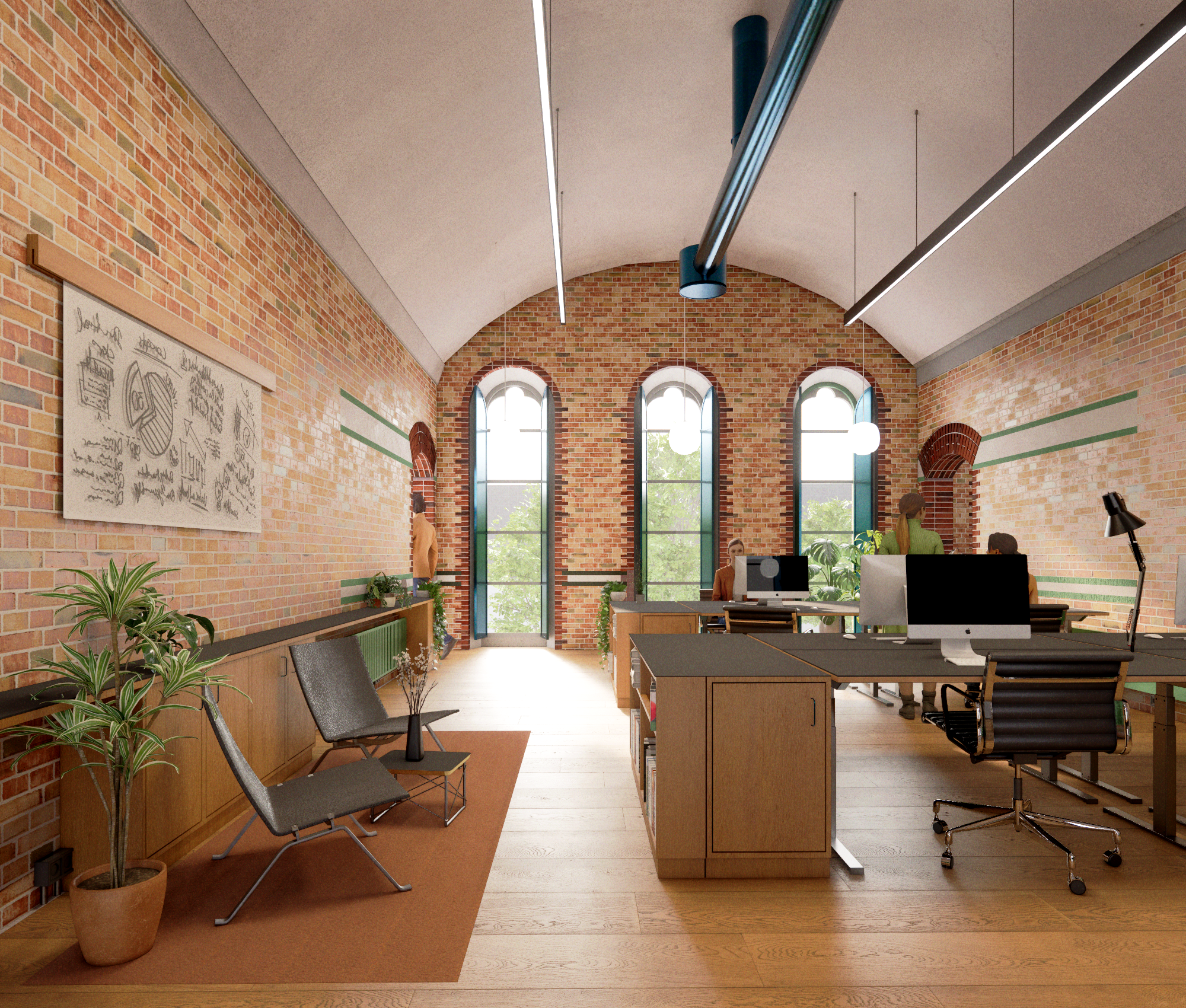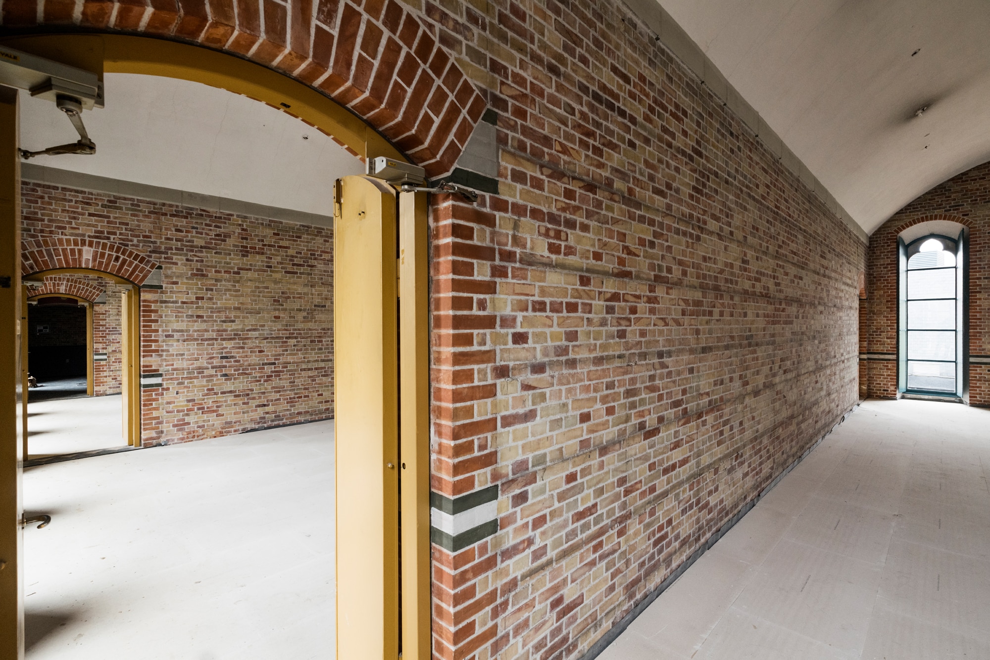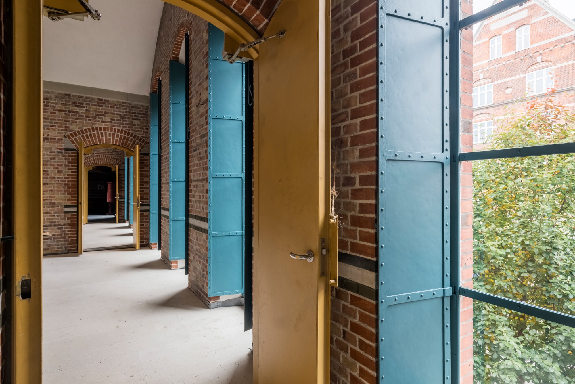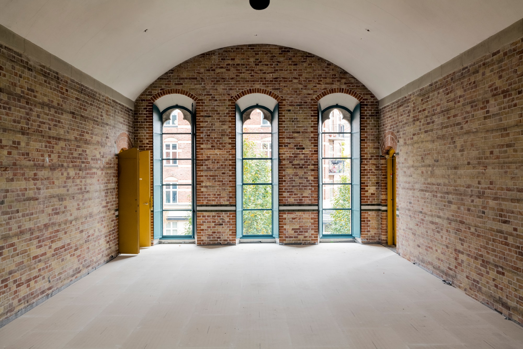 Access to the office lease is located centrally on the ground floor, where an impressive entrance area with an elevator welcomes both employees and visitors. The original architectural details are preserved throughout the first floor, featuring vaulted ceilings, exposed brick walls, and beautiful, continuous ornamentation. Light flows through the large arched windows, ensuring a workspace that stays bright, inspiring, and full of life.