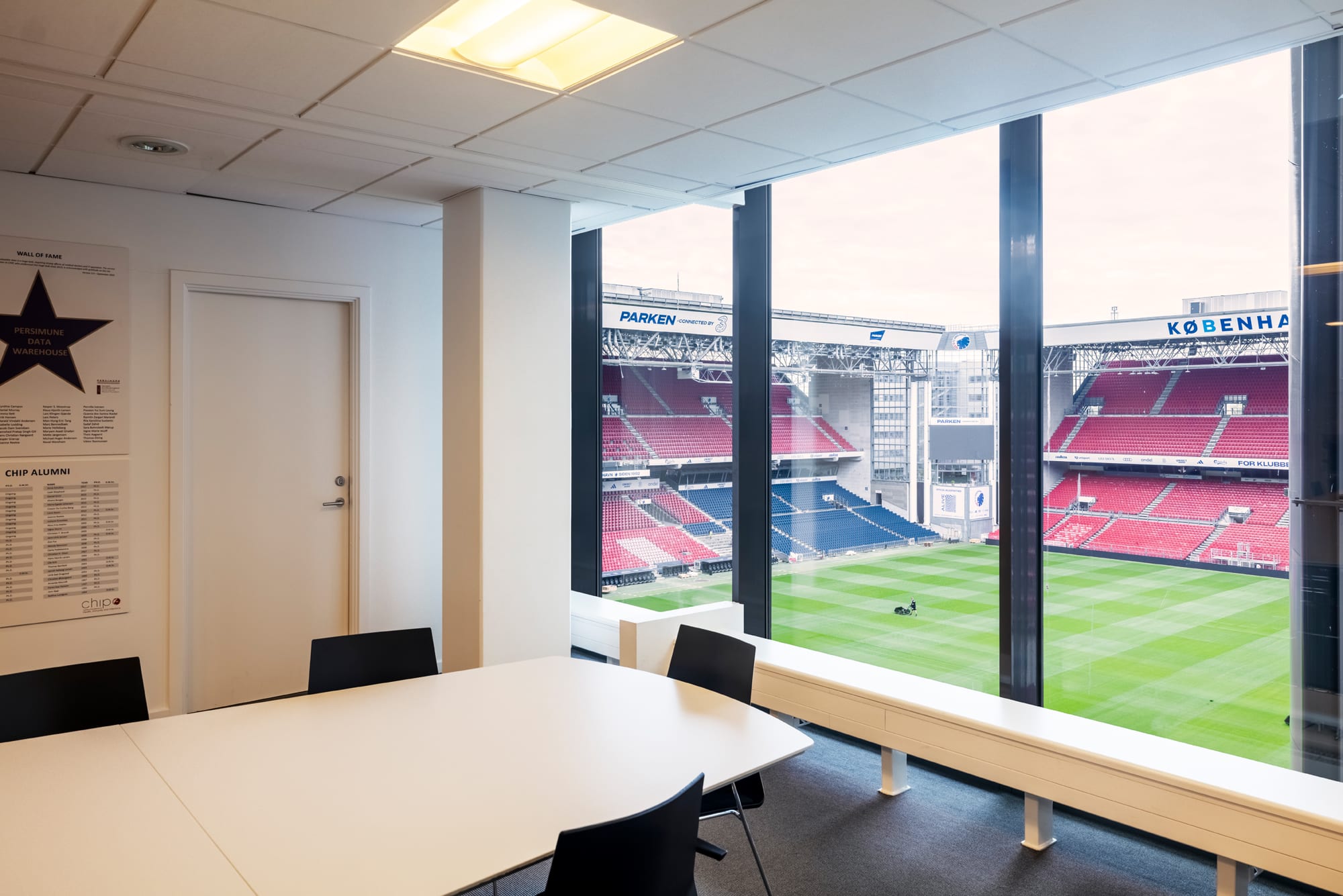 The lease in Tower F1 is located on the 5th floor and comprises 439 m². The office features an open layout with large windows and glass partitions, creating a bright and transparent working environment. It includes three separate meeting rooms and a kitchenette. From the lease, there are direct views of the stadium on one side and Fælledparken on the other.