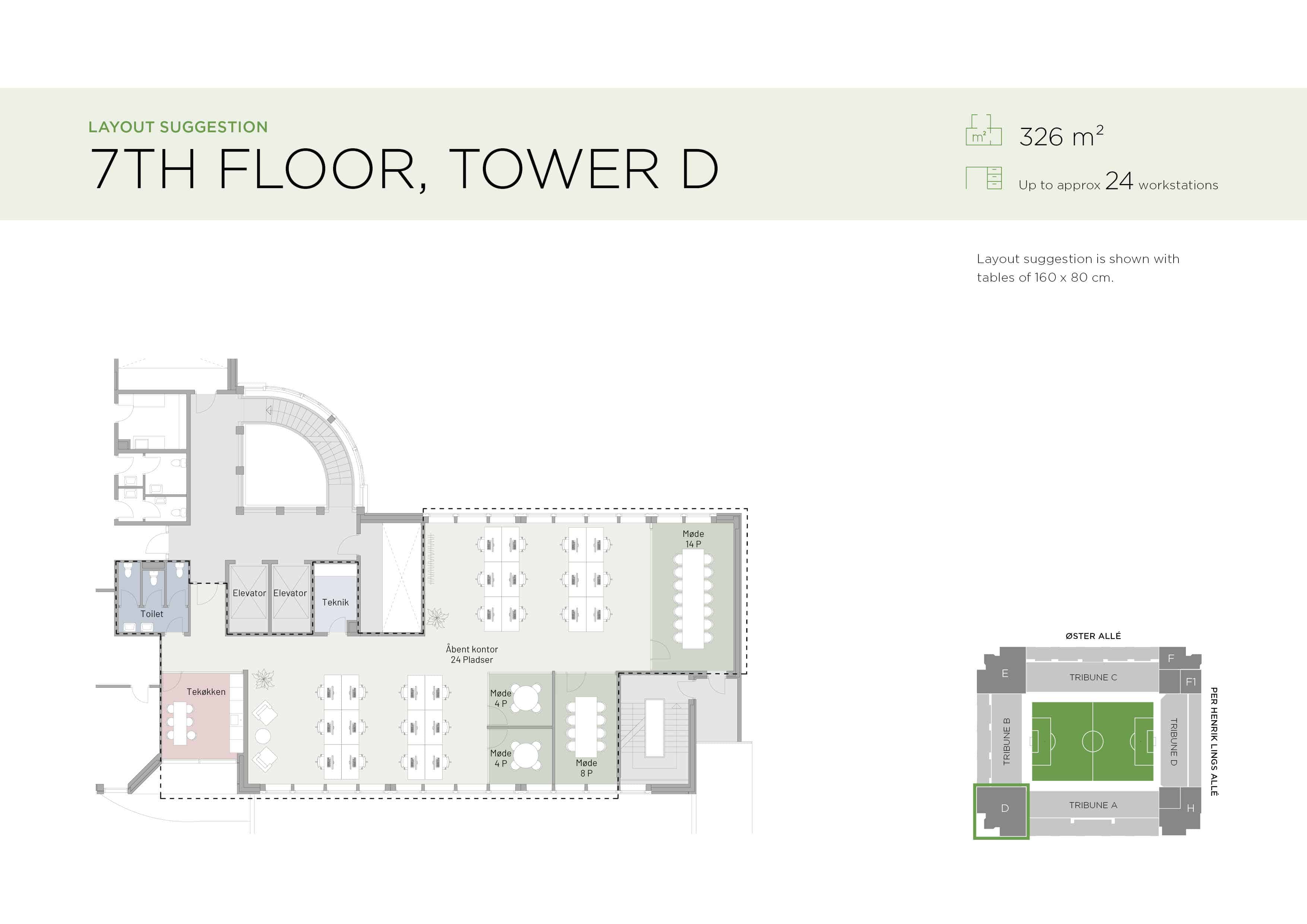 The lease in office tower D is located on the 7th floor and comprises 326 m², and offers an open and spacious layout with light wooden floors, high ceilings, and exposed piping. The lease is ideal for approximately 20 workstations, and from the office, there is a charming view overlooking Østerbro Stadium and the tennis courts. Tenants in Tower D also have access to a large shared terrace.