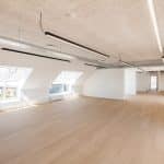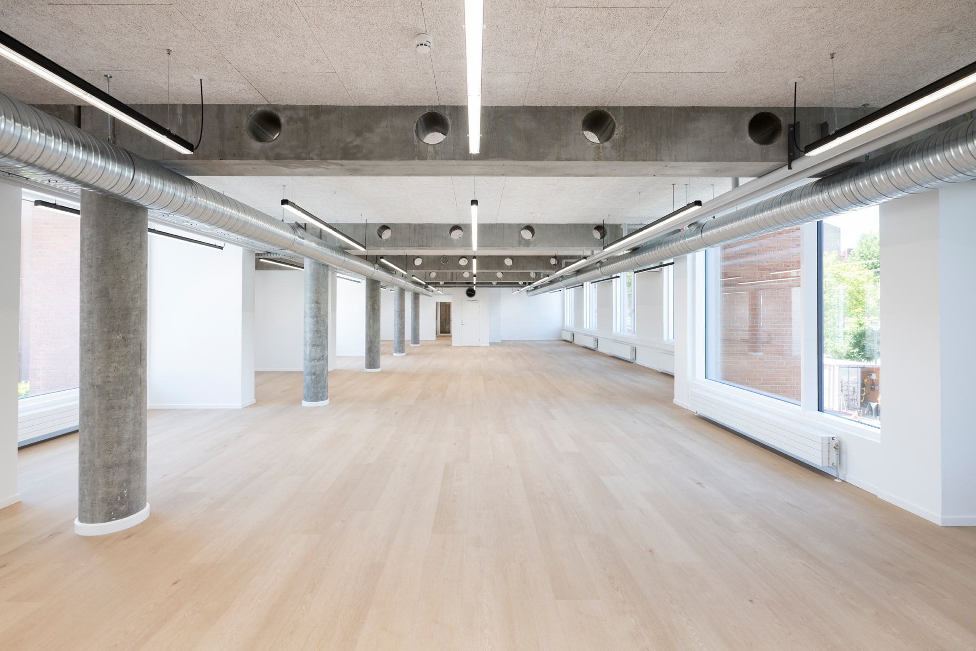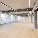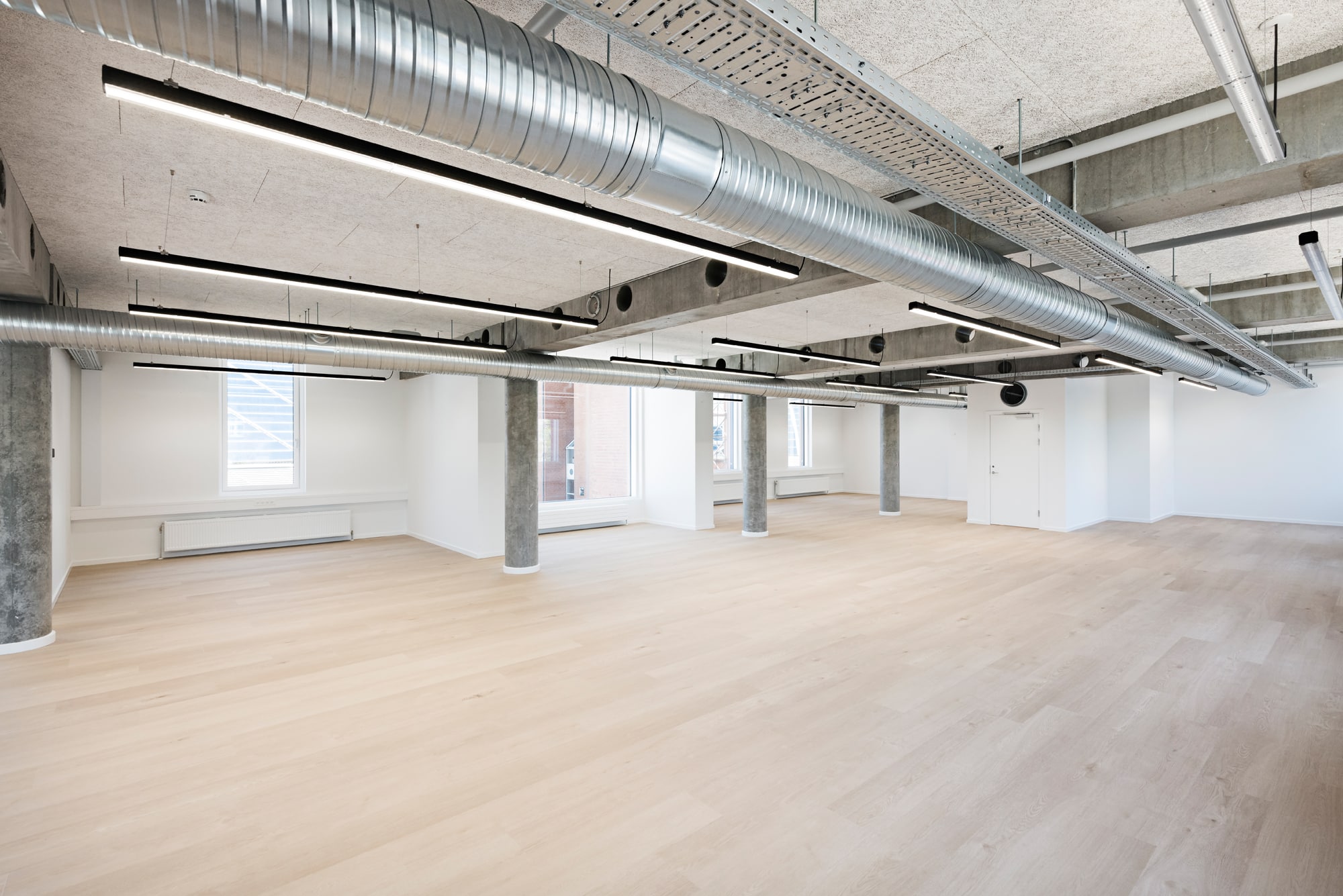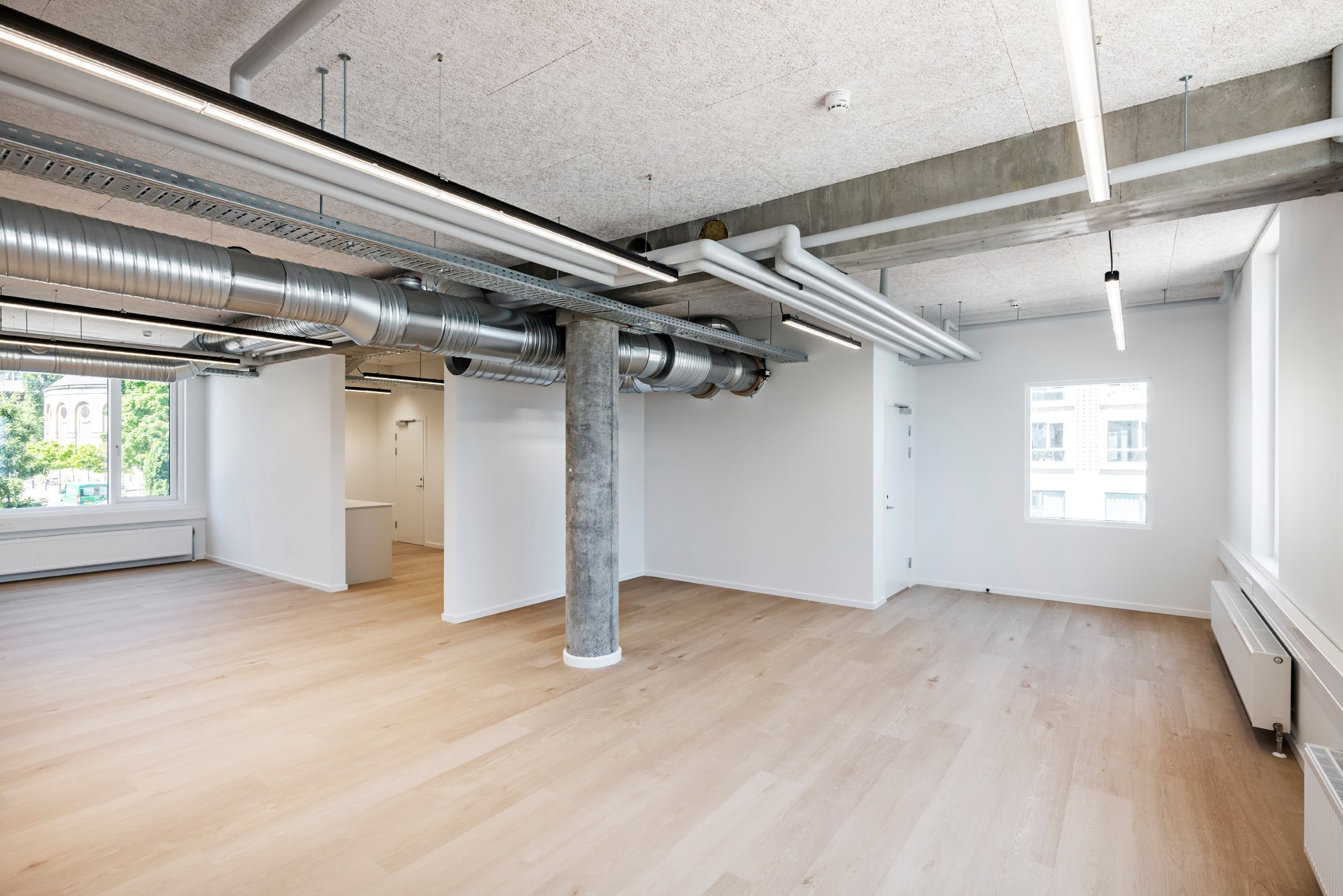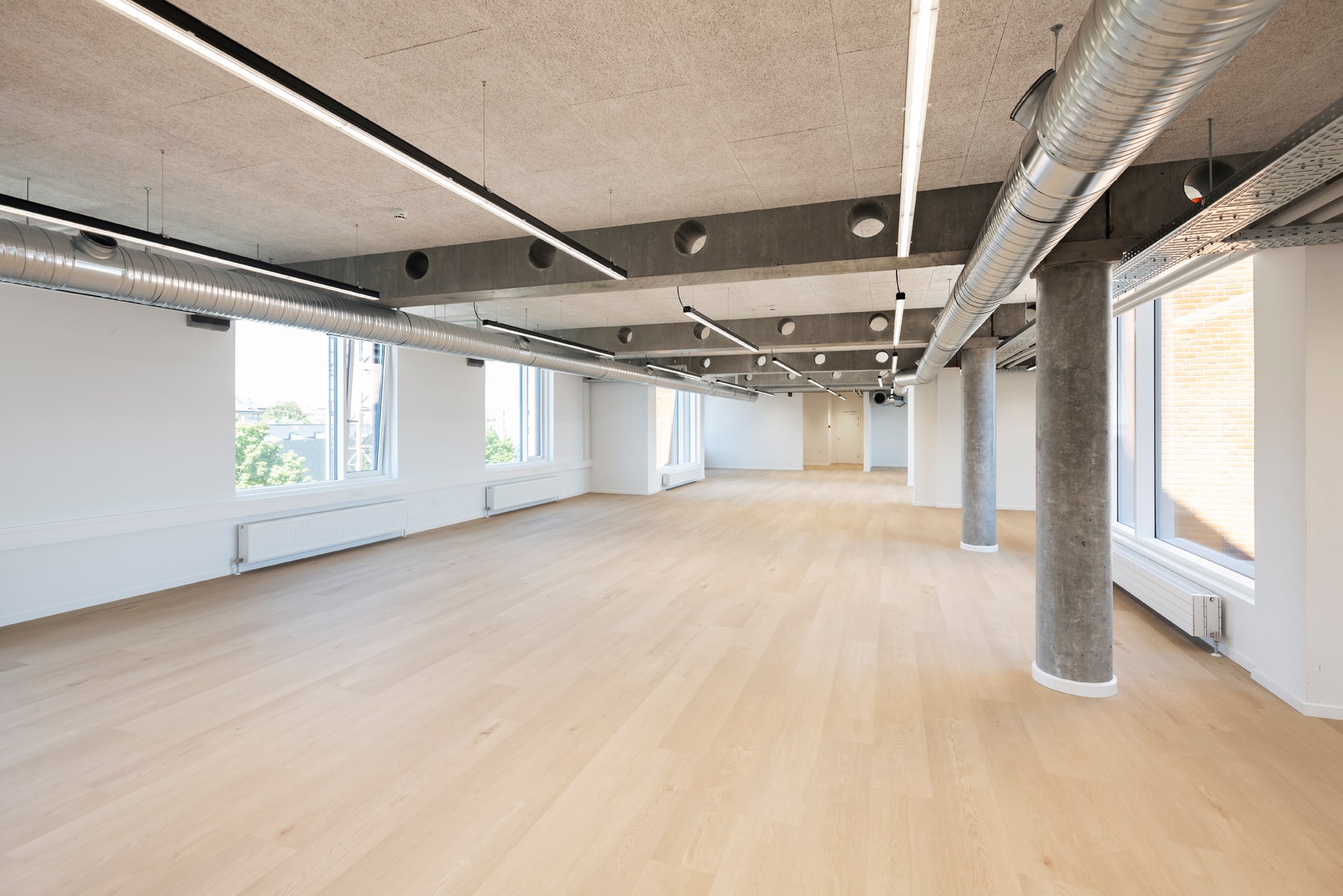 The vacant leases are approximately 540 m² per floor and can be efficiently designed to accommodate up to 46 workstations per floor. Acoustics and indoor climate are excellent, with Troldtekt ceilings, ventilation, and cooling. Exposed concrete columns and visible piping add character to the offices.