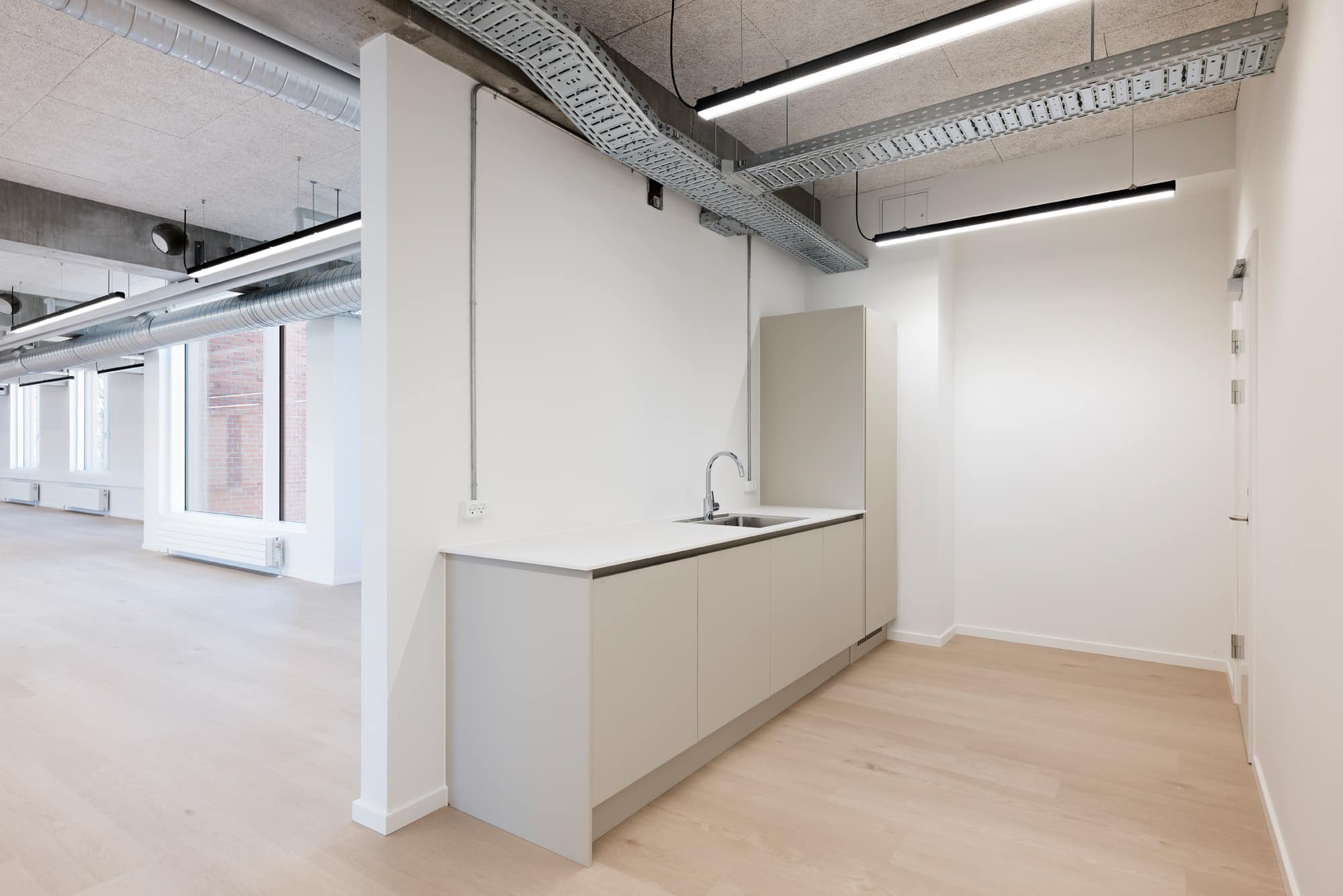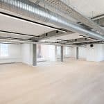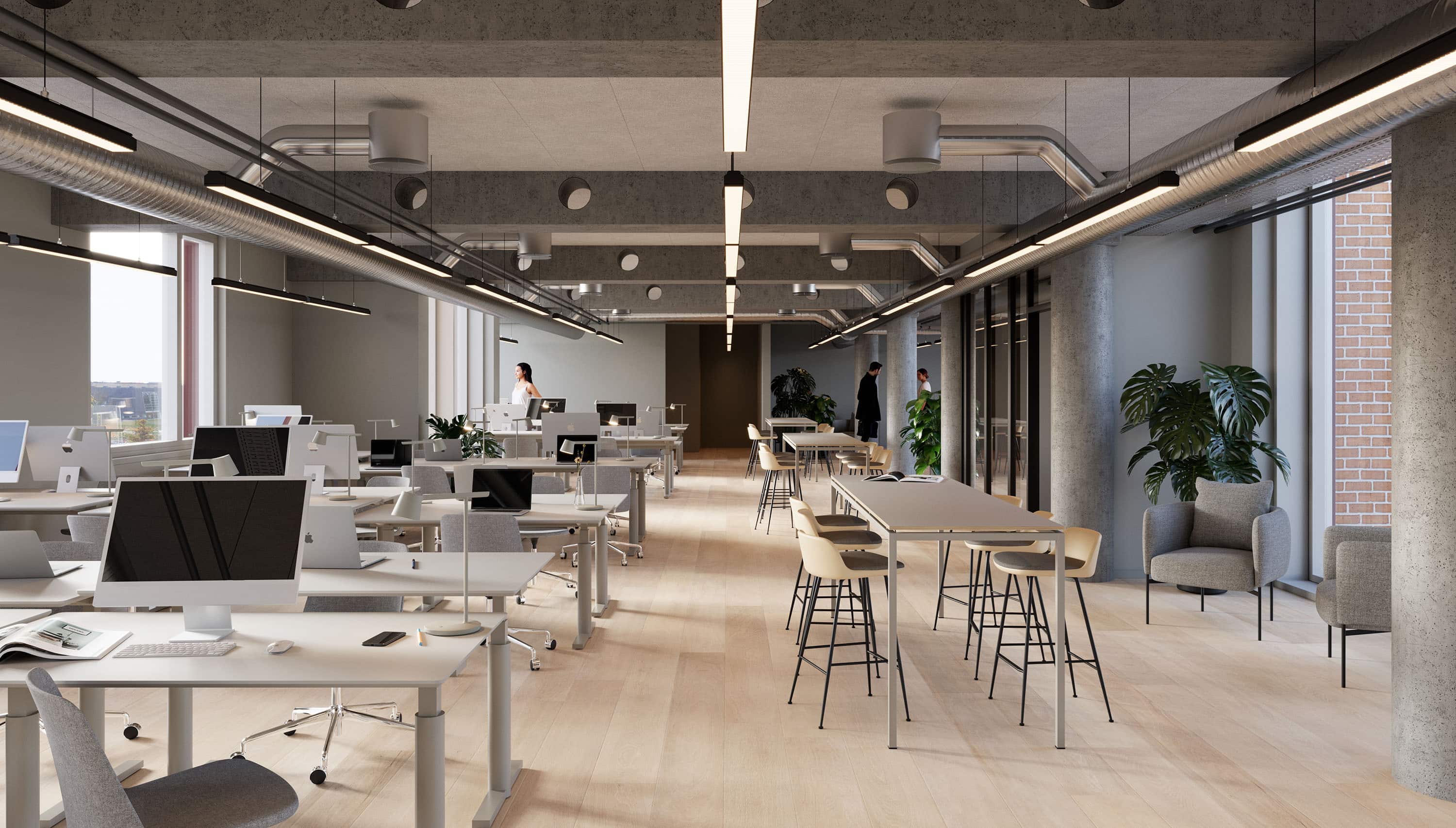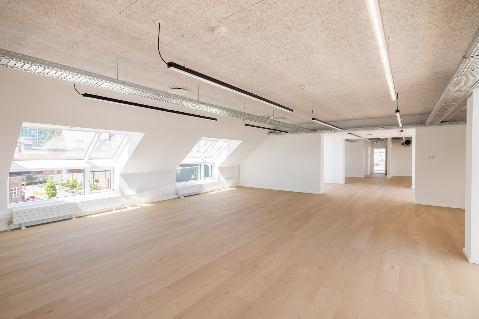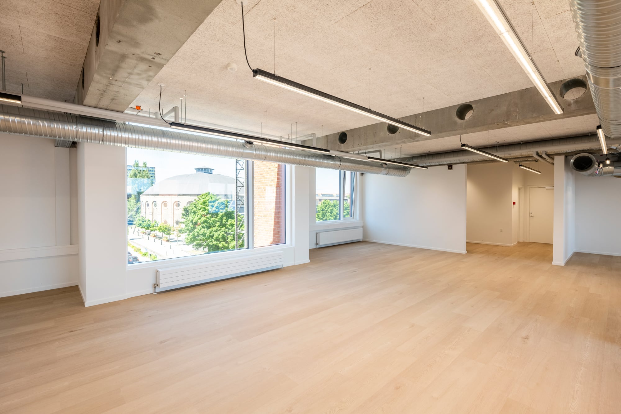 The vacant leases are approximately 540 m² per floor and can be efficiently designed to accommodate up to 46 workstations per floor. Acoustics and indoor climate are excellent, with Troldtekt ceilings, ventilation, and cooling. Exposed concrete columns and visible piping add character to the offices.